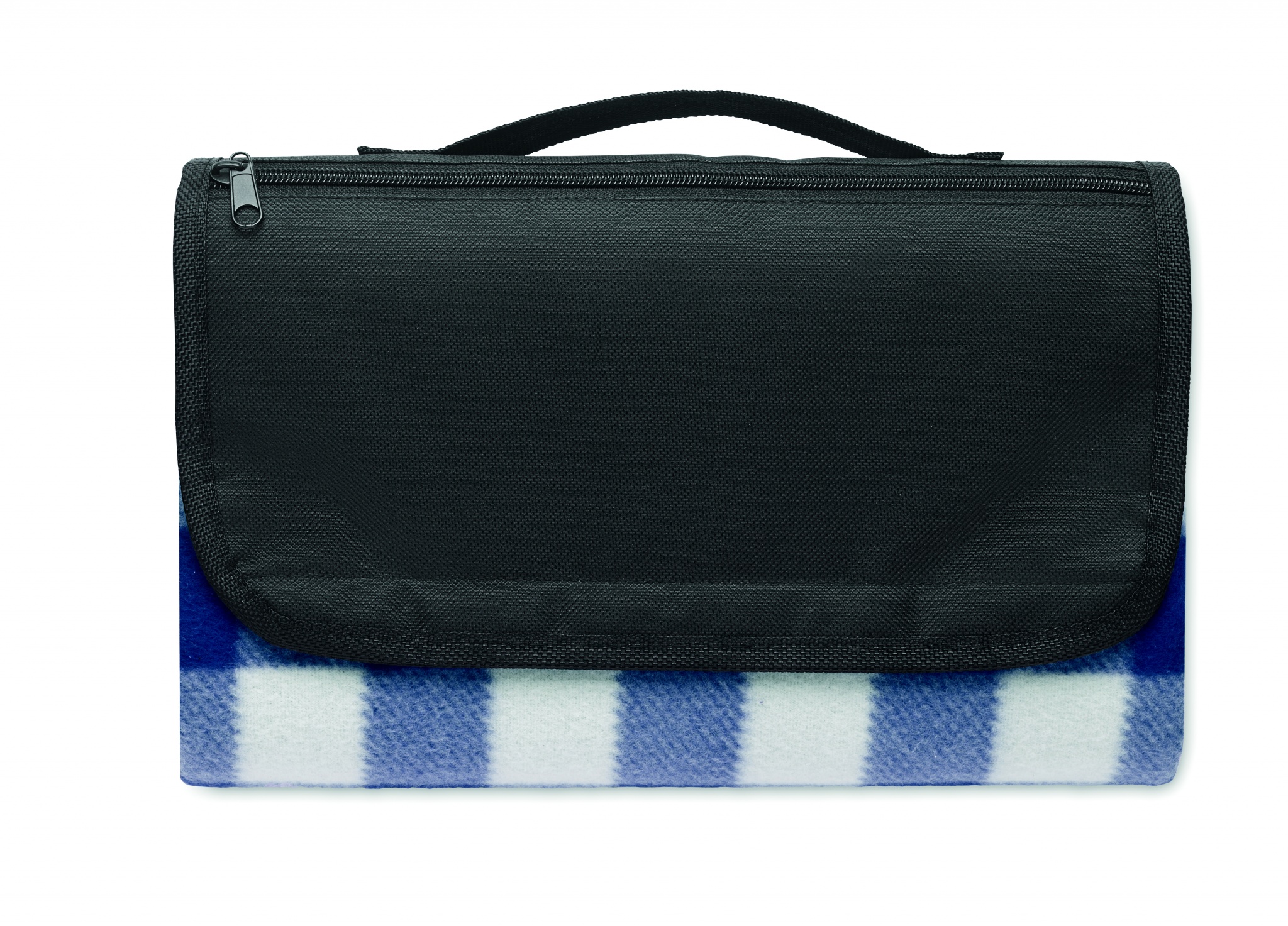 Faltbare Picknickdecke aus RPET Polar-Fleece 150 g/m² mit wasserabweisend beschichteter PEVA-Rückseite. Reißverschlusstasche auf der Vorderseite und kurzer Tragegriff .