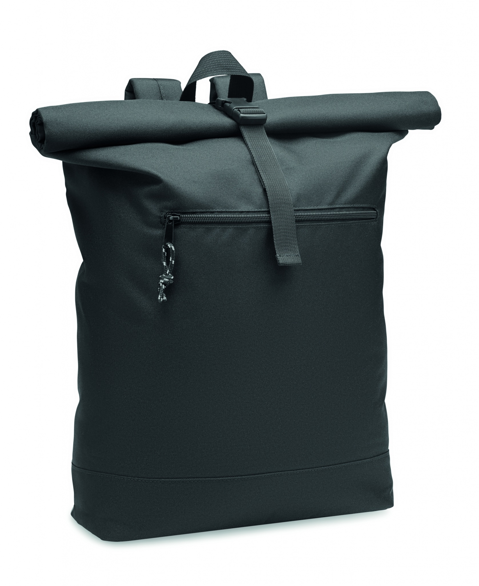 Rucksack mit Rollverschluss aus 600D RPET Polyester. Gepolsterter Rücken und verstärkter Boden. Fronttasche mit Reißverschluss. Futter 210D RPET.