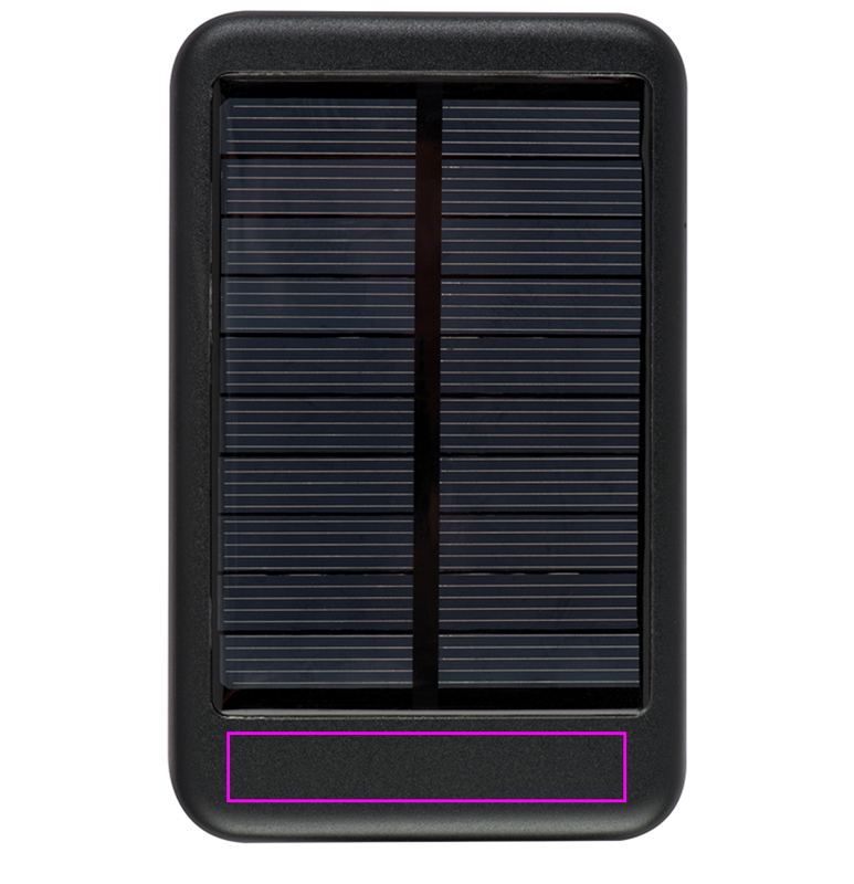Solar-Powerbank (bestückt mit 20 Solarpanelen) aus Metall mit 4.000 mAh Kapazität und USB-Ladekabel. Damit können Sie Ihr Smartphone oder Tablet auch unterwegs und ohne Steckdose aufladen. Ihr Logo drucken wir unterhalb des Solarfeldes.