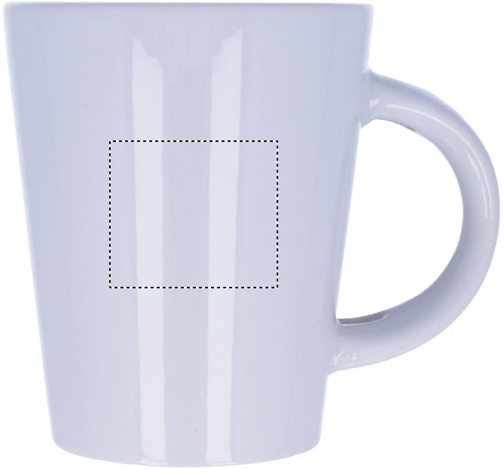 Tasse aus Keramik mit Löffel. Spezielle Beschichtung für Sublimationsdruck. Füllmenge: 300 ml. Verpackt in einem weißen Karton. Für einen langanhaltenden Sublimationstransfer empfehlen wir Spülmaschinenreinigung bis max. 40°C. Tampondruck ist nur für die leichte Handwäsche geeignet.