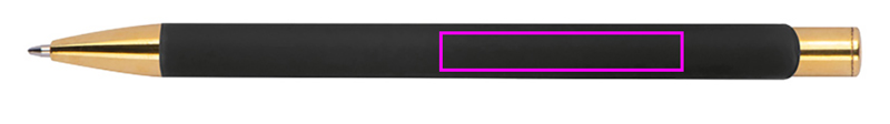 Ball pen made of aluminum with gold applications, rubber finish and blue writing large capacity refill. Your logo will be lasered on the right side of the clip, it will appear in gold color.