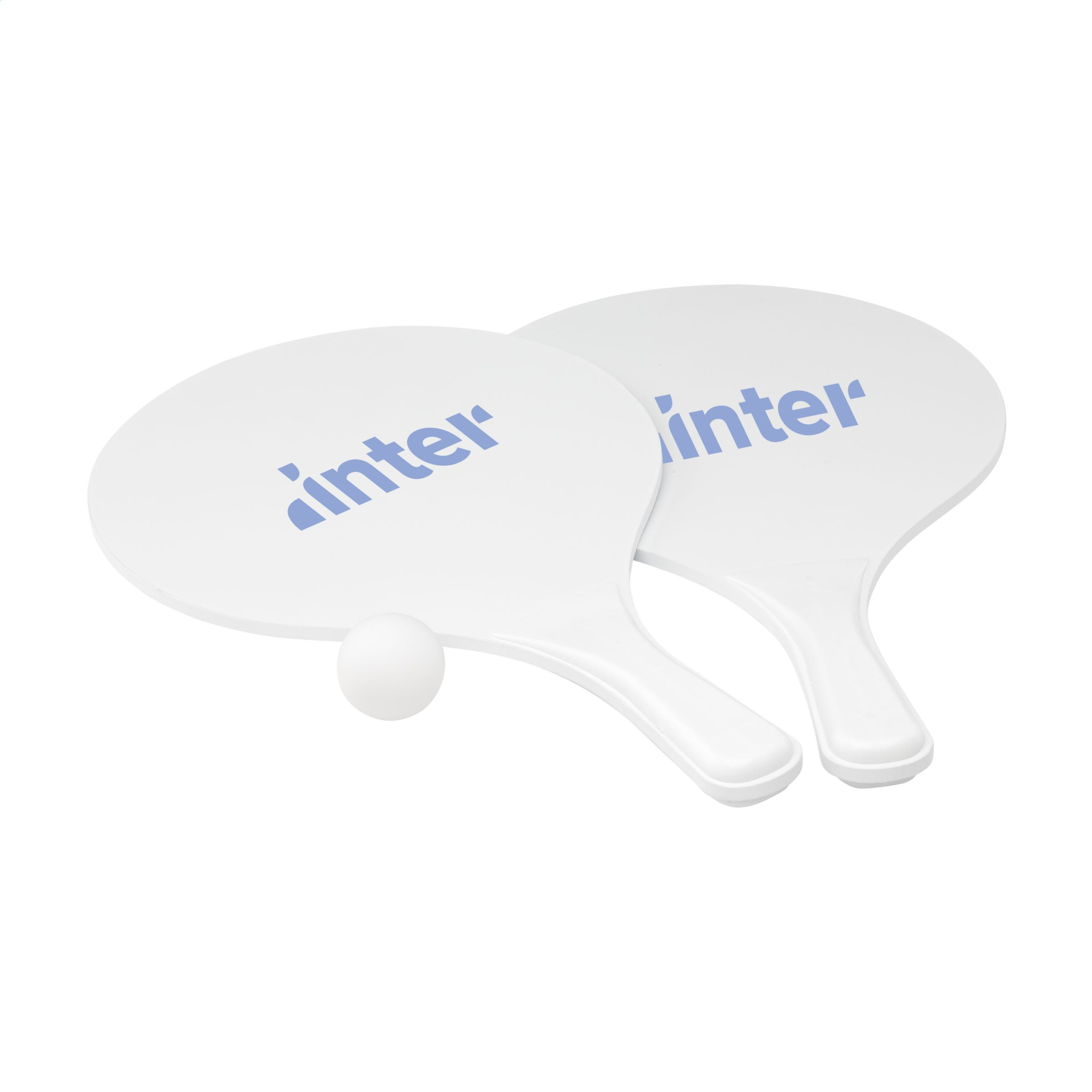 Sporty beach set: 2 rackets made from MDF wood with PP plastic handles and supplied with a rubber ball. Each set comes in a mesh storage net.