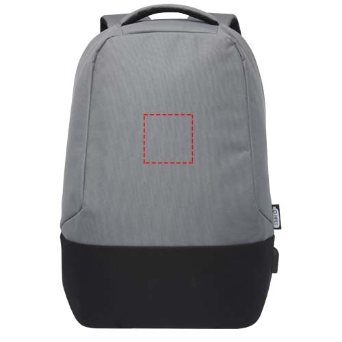 GRS certified backback featuring an open main compartment with organization panel, padded 15" laptop sleeve, and 2 RFID protection pockets. USB port on the right side to easily connect and charge devices from the interior. Comes with padded shoulder straps, right shoulder strap, hidden zipper pocket, grab handle, and a trolley pass-through. Approximately 15 plastic bottles are recycled to make this bag.