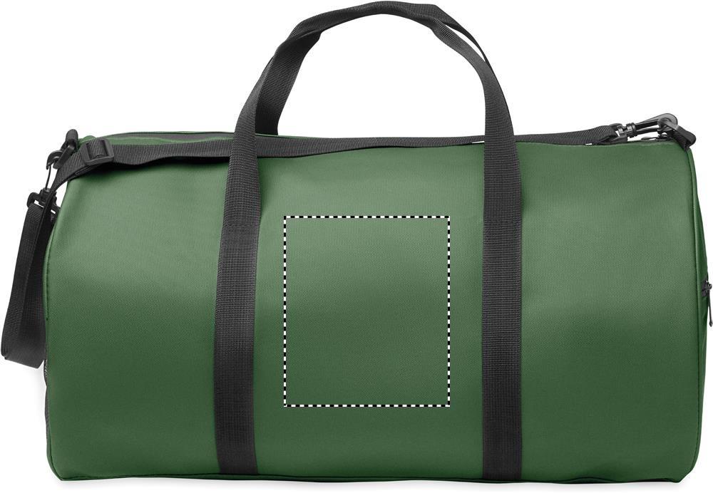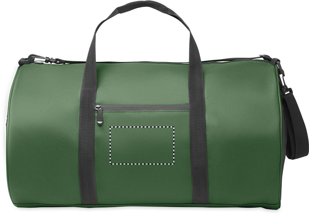 Duffle bag in 600D RPET polyester with PU coating. Front zippered pocket. Inside 210D RPET polyester lining. 1 side zippered compartment / 1 side mesh compartment. Zippered pocket inside.
