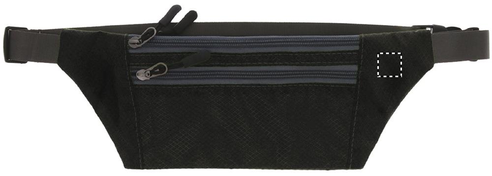 Fanny bag in jacquard polyester with 2 zippered front and 1 zippered back compartment and adjustable waist strap.