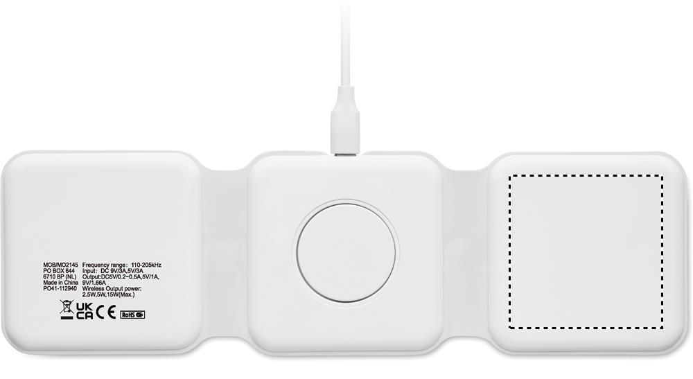 3 in 1 foldable charging station in ABS. It has 3 wireless charging spots (15W). Input: 2-in-1 Type-C and Type-A. Compatible with all QI enabled devices such as latest Androids, iPhone® 8, X and newer. Also compatible with iWatch.