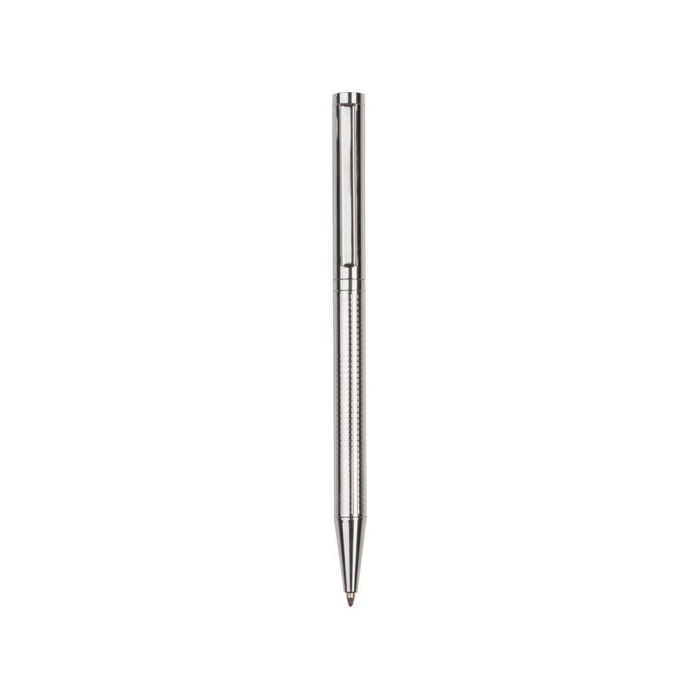 An elegant and smooth Pierre Cardin metal ballpoint pen with a rotating mechanism. The body of the pen is decorated with checkerboard engraving. It contains a quality blue refill with a 1 mm tip and one black spare refill. Packed in a gift box, comes with a certificate of authenticity.