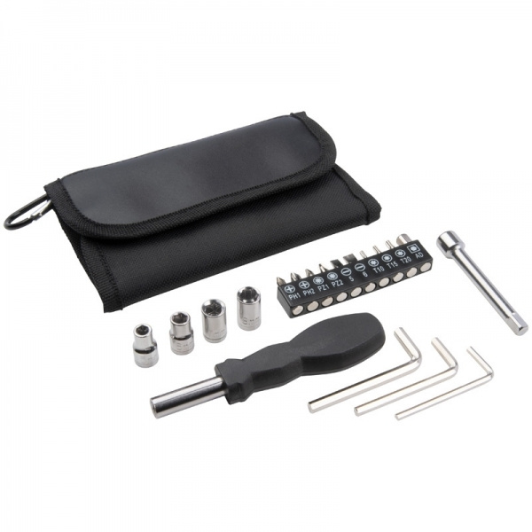 The tool set consists of a screwdriver with various nuts and bits, an extension piece, and three hexagonal keys in different sizes, and a practical pouch with snap hooks where we print your logo. The set is individually packed in a polybag.