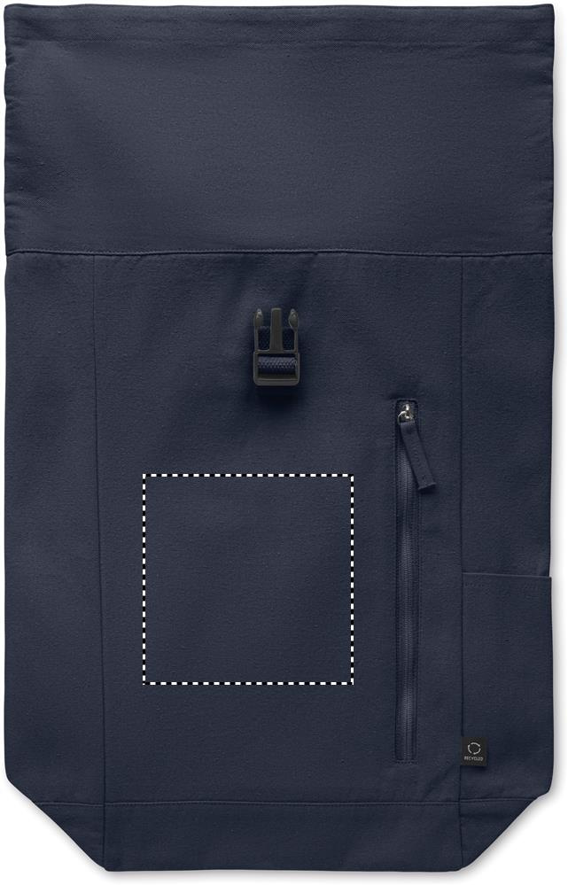 Roll top backpack with hook and loop closure in 390 gr/m² recycled cotton (80%) and recycled polyester (20%). Zippered front pocket.