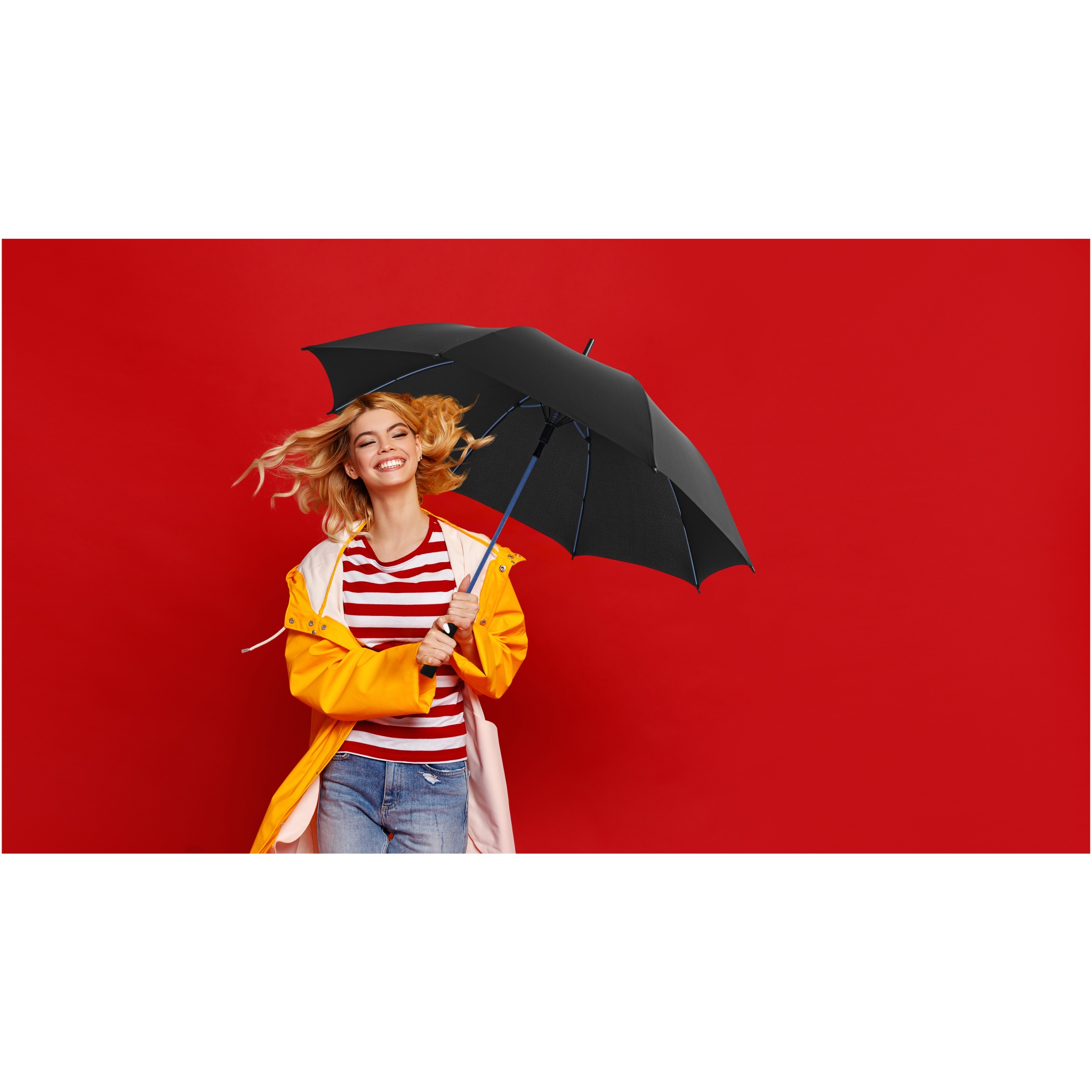 Automatic opening 23" storm umbrella. Pongee canopy and matching pouch, colour pop fibreglass shaft and fibreglass ribs. Colour matching stitching on umbrella closure strap. Windproof system. Exclusive design.