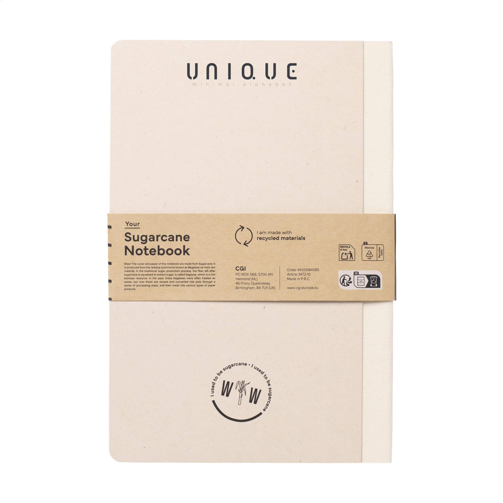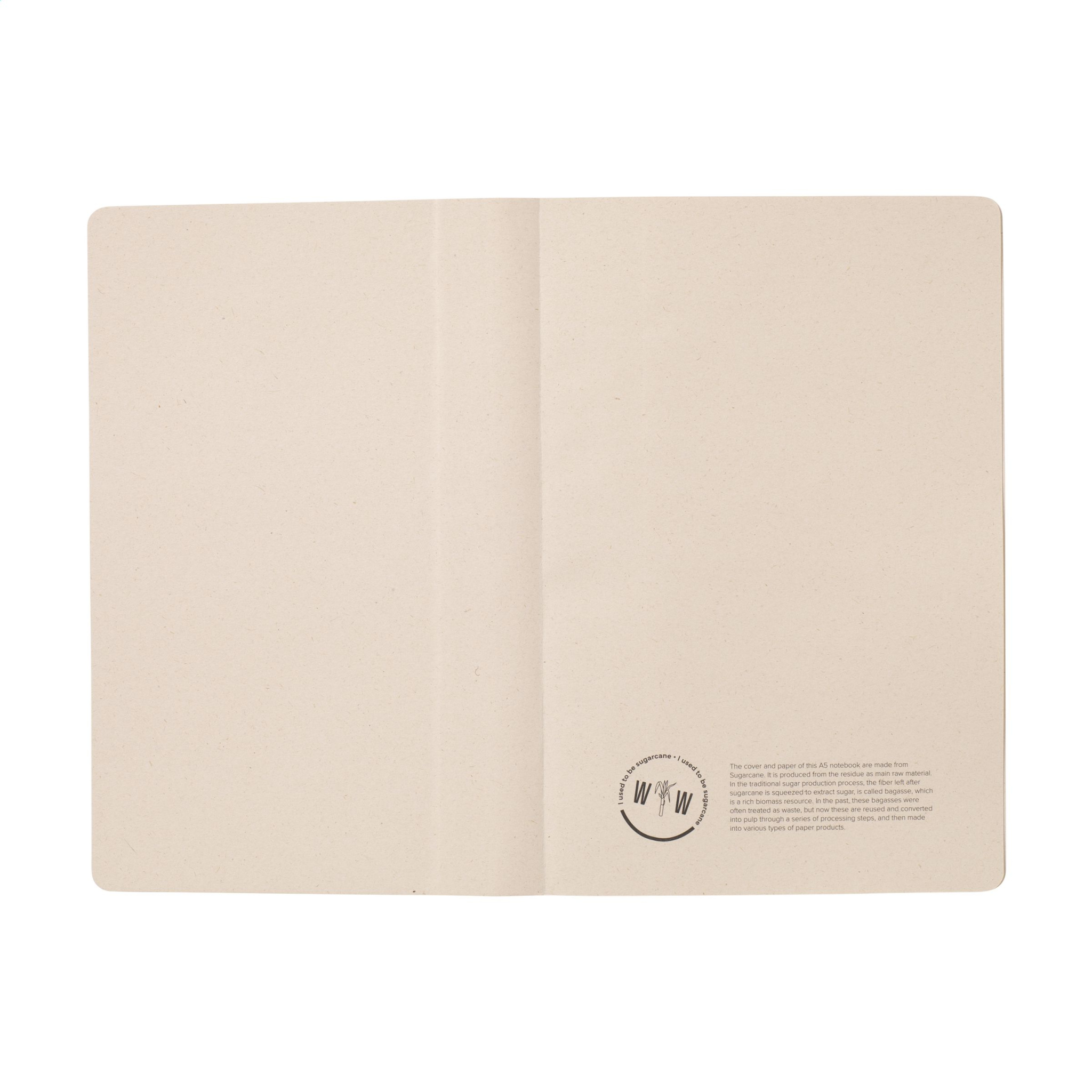 WoW! Exclusive A5 notebook made from the recycled waste of the sugar cane plant. With hard cover and 80 sheets/160 pages of lined paper (100 g/m²). The cover and paper are FSC® certified. The paper, in which small fibres are visible, has a beautiful light brown colour. This emphasises the use of natural materials. After harvesting, the roots of the sugar cane plant remain in the ground. The stems and leaves are processed into a residue that is used to make bio-plastic. A sugarcane plant extracts CO2 from the air during growth and can live for up to 10 years.