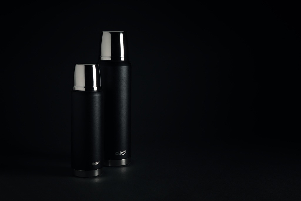 The Swiss Peak Elite series are with vacuum insulation and double wall 18/8 grade stainless steel. The powder coated black colour is built to last! No fading or cracking here! The inner wall is plated with copper for ultimate conductivity to keep drinks hot for 8 hours and cold for 24 hours. Hand washable and leakproof. Content 1000 ml.