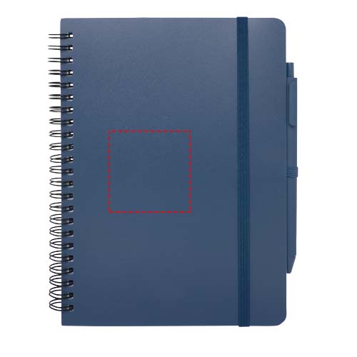 The Thalaasa A5 hard cover notebook is made of ocean bound recycled plastic with 80 lined sheets of 70 g/m² cream coloured paper. The notebook has rounded corners, an elastic closure, and a pen loop. The ballpoint pen with black ink is also made of ocean bound recycled plastic. Writing length: 1000 metres. Nib size: 1.0 mm.