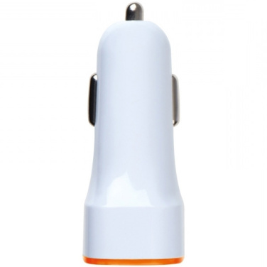 Stylish charging adapter for the 12V car socket with two slots for fast or regular charging, the color ring lights while charging. We print your logo above the ring.