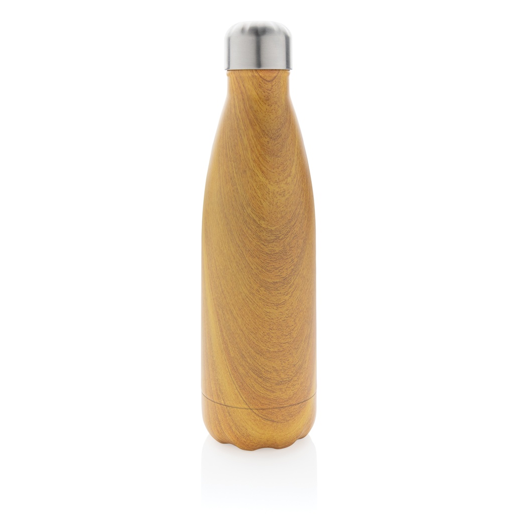 Vacuum insulated stainless steel bottle with wood print, brown