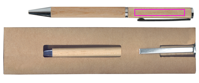 Classic wood pen with a blue-writing plastic refill and a cardboard case. We engrave your logo below the clip.