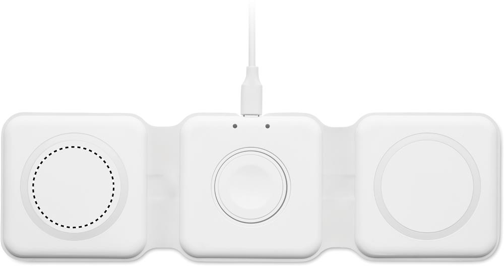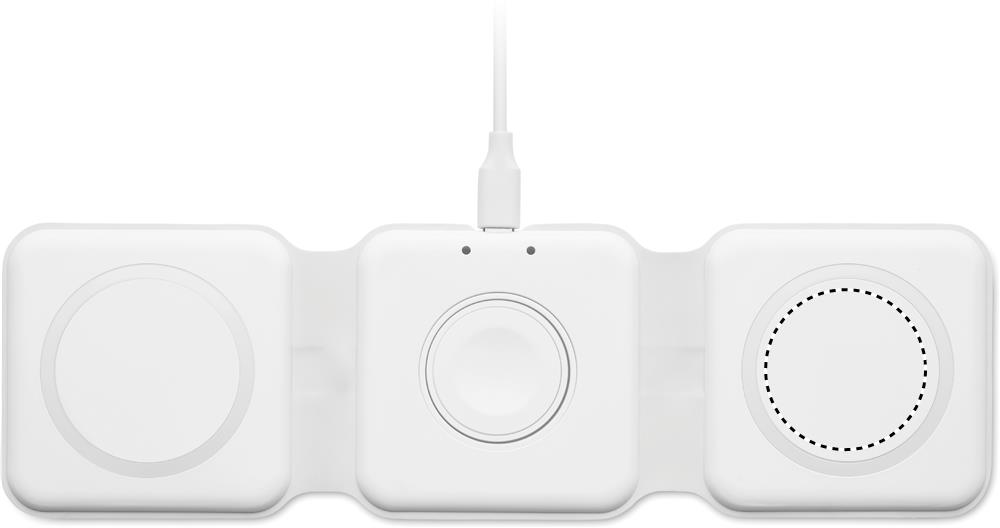 Kolm-ühes kokkupandav ABS-laadimisjaam. Sellel on 3 juhtmevaba laadimiskohta (15 W). Sisend: 2-in-1 Type-C ja Type-A. Ühildub kõigi QI-toega seadmetega, nagu uusimad Androidid, iPhone® 8, X ja uuemad. Ühildub ka iWatchiga.