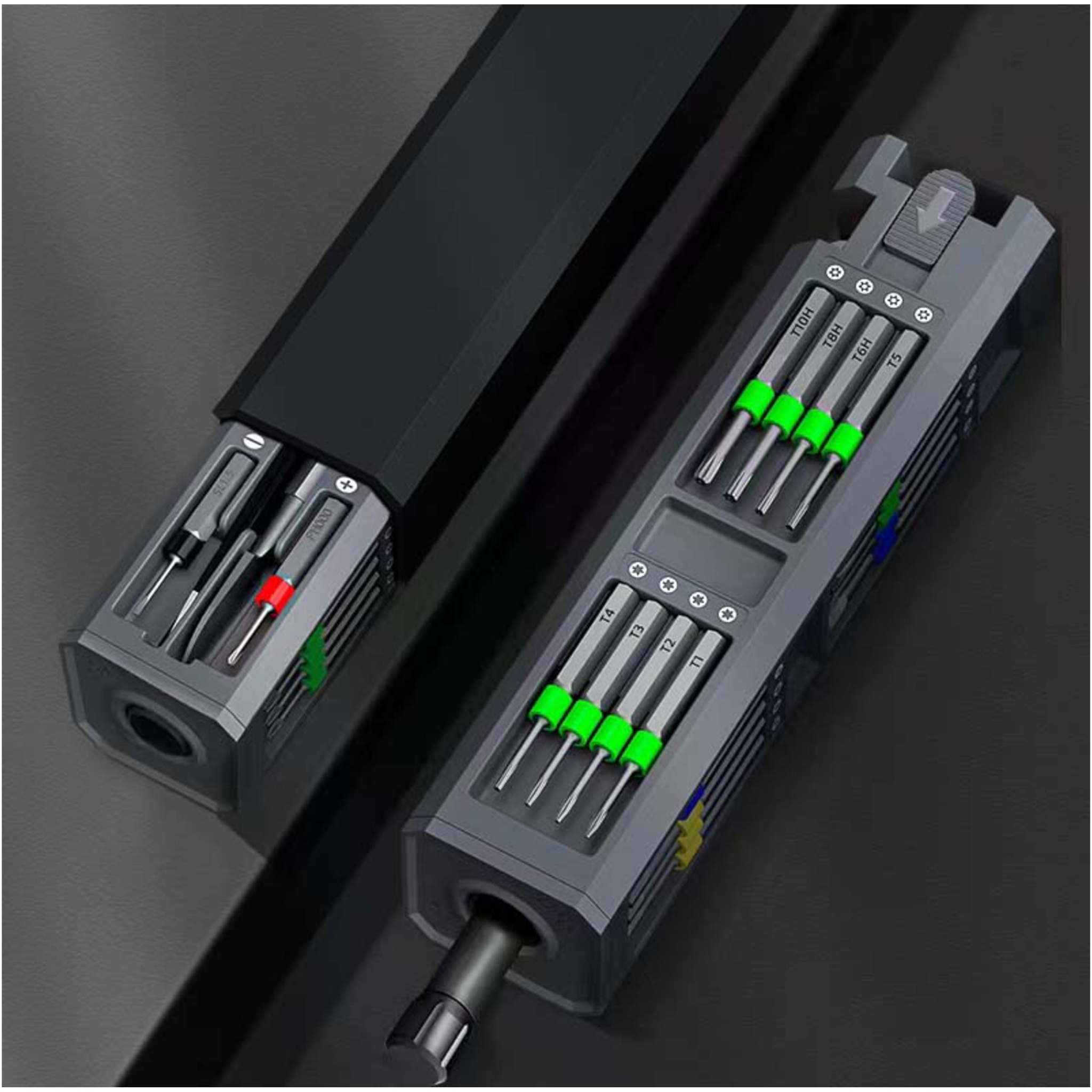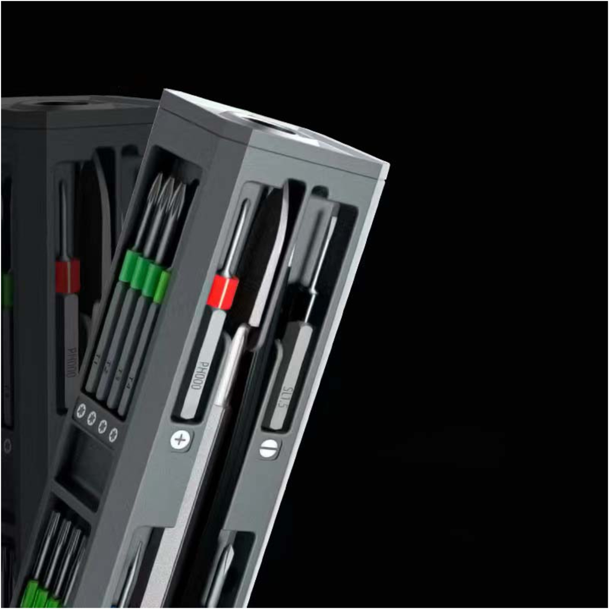 30-osaline täppiskruvikeerajate komplekt 28 otsiku ja kahe tarvikuga. Oksüdeeritud alumiiniumist korpust (15 x 3,6 x 3,6 cm) saab isikupärastada graveeritud logoga. Kompaktse korpuse abil on lihtne kõike ühes kohas hoida. Käsikruvikeeraja sobib suurepäraselt iga väikese seadme parandamiseks ning tänu oma kujule on seda lihtne kasutada ja käsitseda. Sellel on lai valik otsikuid, mis muudavad selle universaalseks mitmesuguste isetegemistegevuste jaoks. Iga bititüüp on märgistatud erineva värviga, et neid oleks lihtne tuvastada. Otsad tõmmatakse kruvikeeraja külge magnetiliselt. Komplektiga on kaasas ka pintsetid väikeste esemete korjamiseks ja raudkang korpuste tõstmiseks ja avamiseks. Pakitud magnetkinnisega kinkekarpi (17 x 55 x 43,5 cm). Sisaldab 3-aastast garantiid.