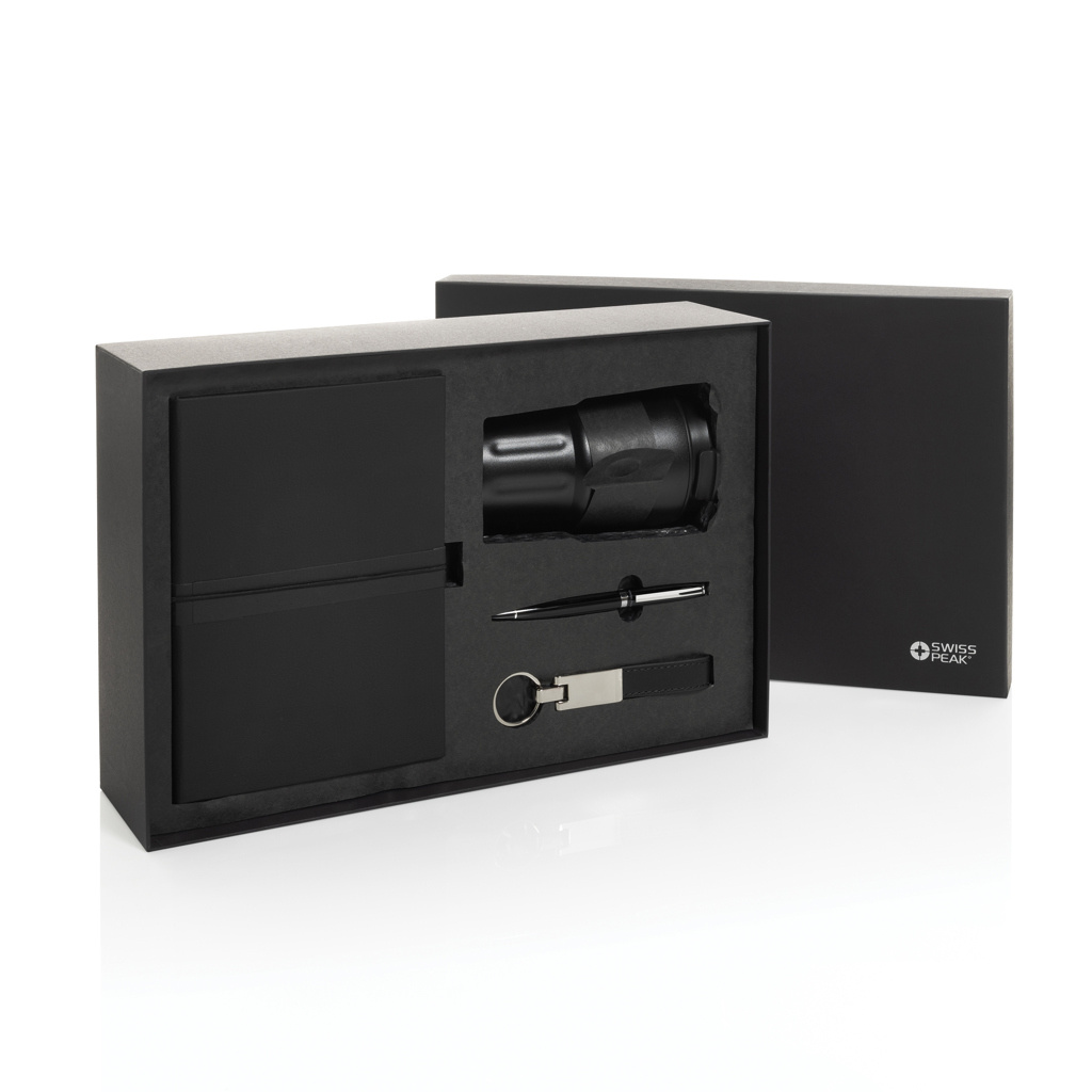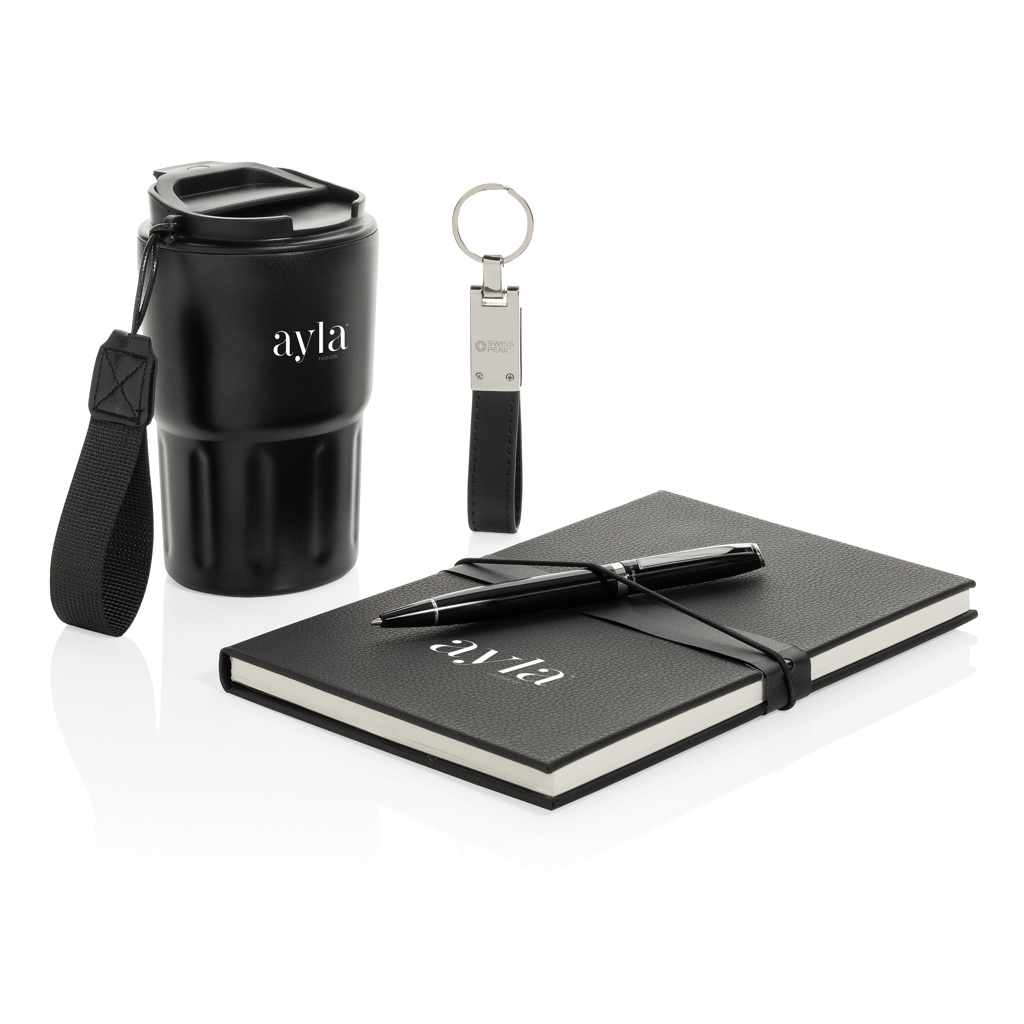 See luksuslik kinkekomplekt sisaldab 350 ml topeltseinaga lekkekindlat termoskruusi. Komplekt kuulub ka kvaliteetne Swiss Peak võtmehoidja, millel on läikiv metallikviimistlus ja PU-nahast rihm, elegantne pastakas, mille kirjutusmaht on 1000 meetrit, ja pehme puutetundlik PU-märkmik, mis on valmistatud taaskasutatud polüestrist. Märkmik sisaldab 160 kreemikat lehte, mis on valmistatud taaskasutatud paberist. Kõik selle kinkekomplekti tooted on RCS-sertifikaadiga. 75% ulatuses taaskasutatud materjalist koosnev kinkekomplekt.