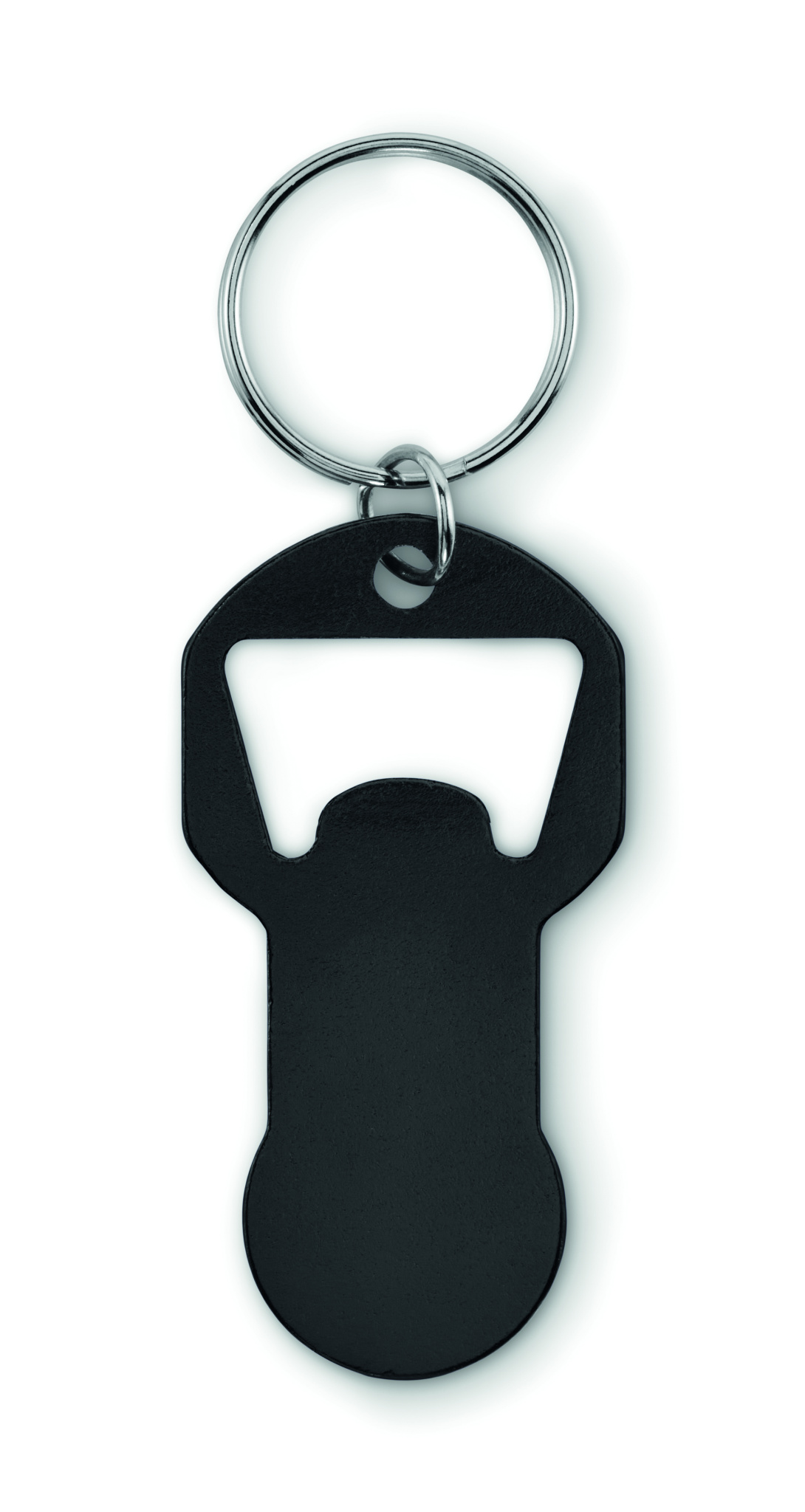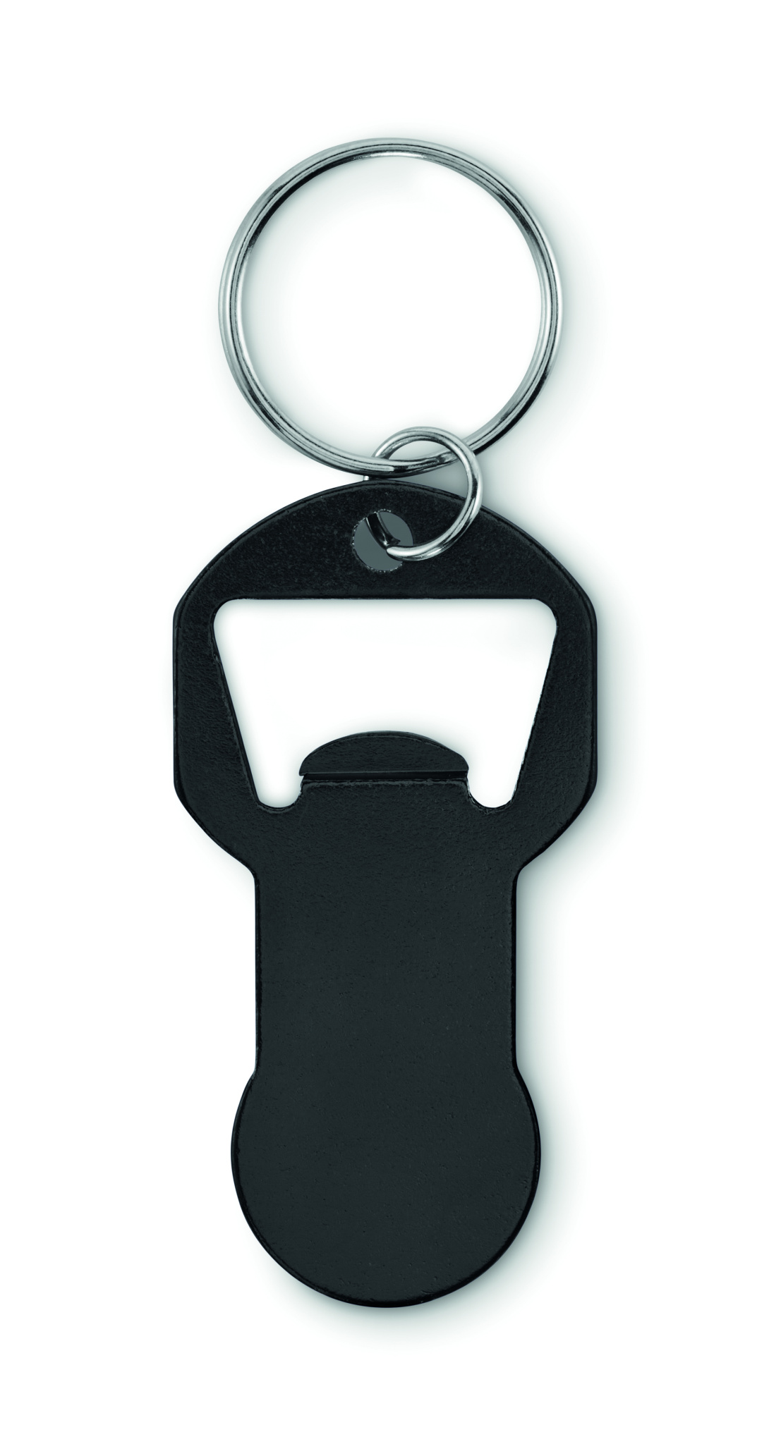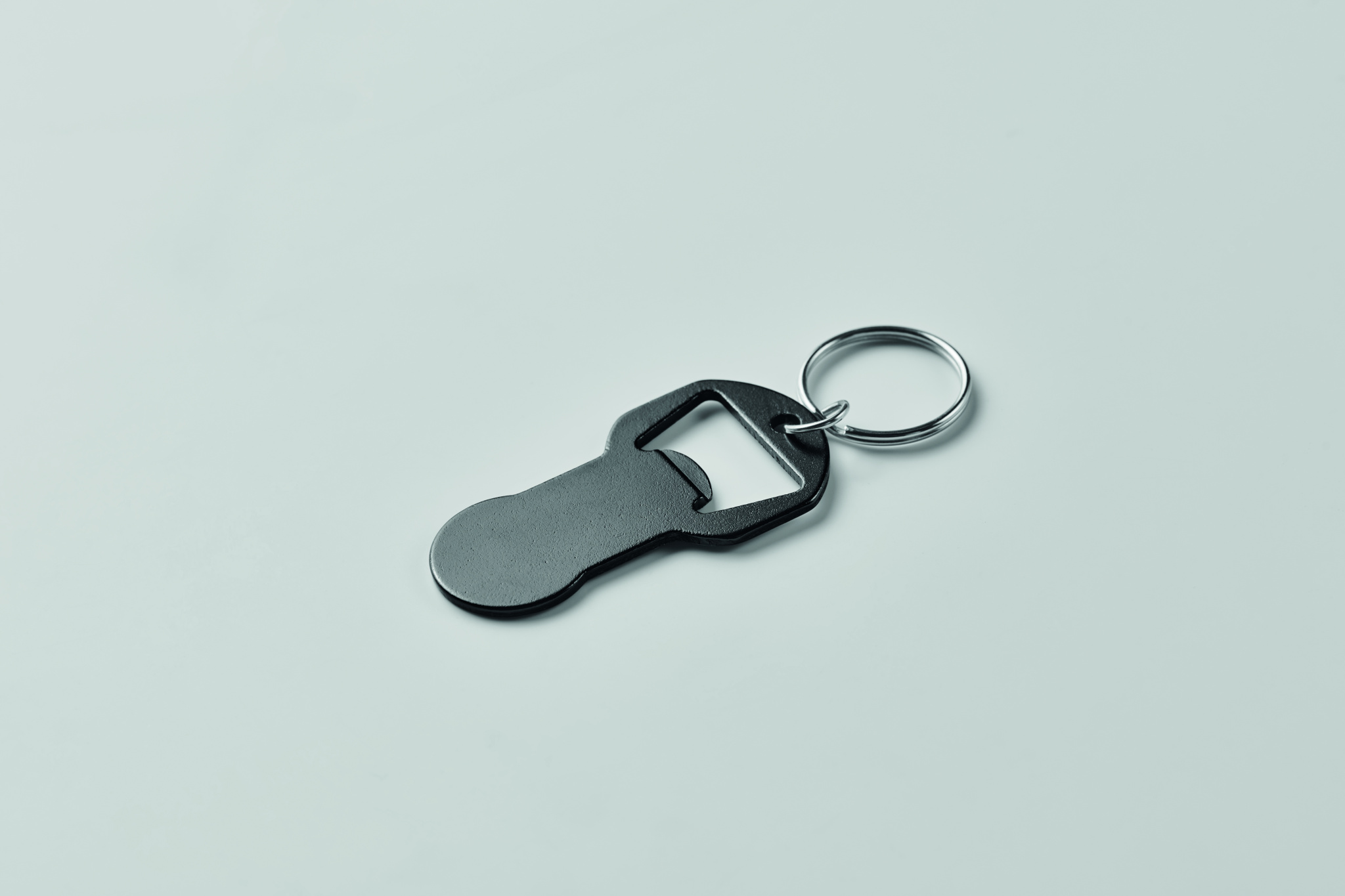 Pudeliavaja võtmehoidja, mis on valmistatud taaskasutatud alumiiniumist ja millel on rauast rõngas.