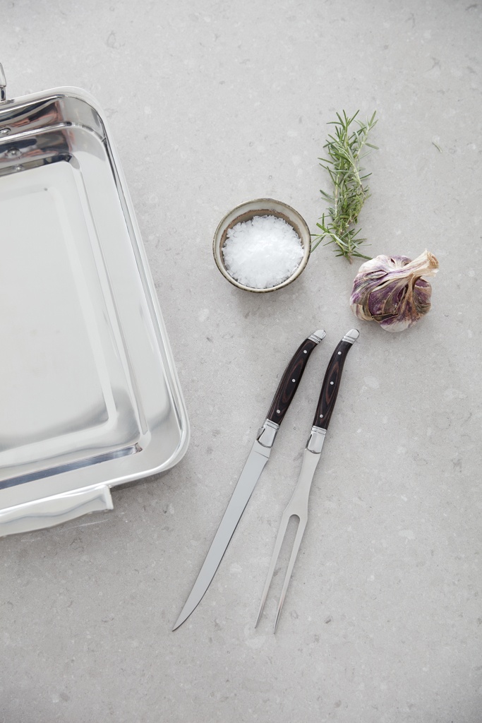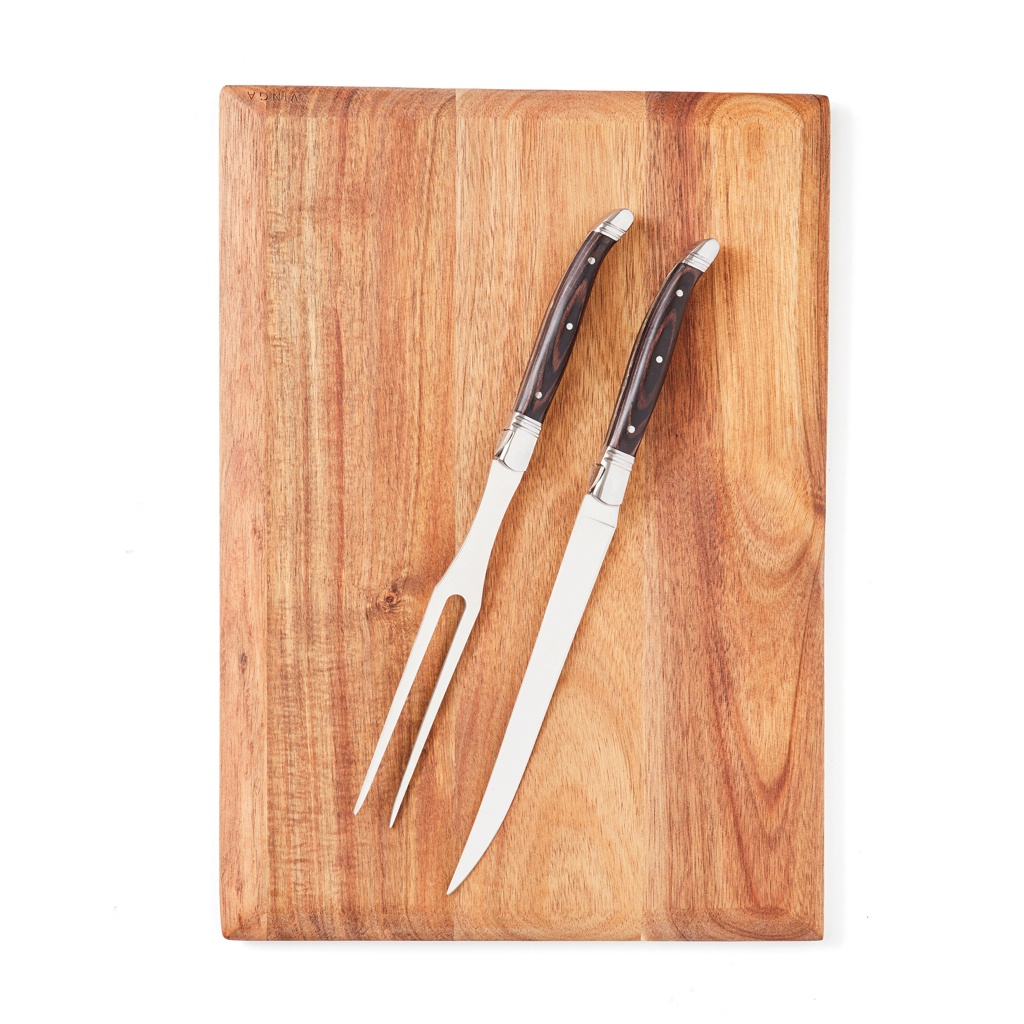Trancheri komplekt noa ja kahvliga tüüpilises Prantsuse stiilis bistroostiilis. Must pakka puidust käepide ja kvaliteetsed roostevabast terasest terad. Pakitud eksklusiivsesse kinkekarpi.