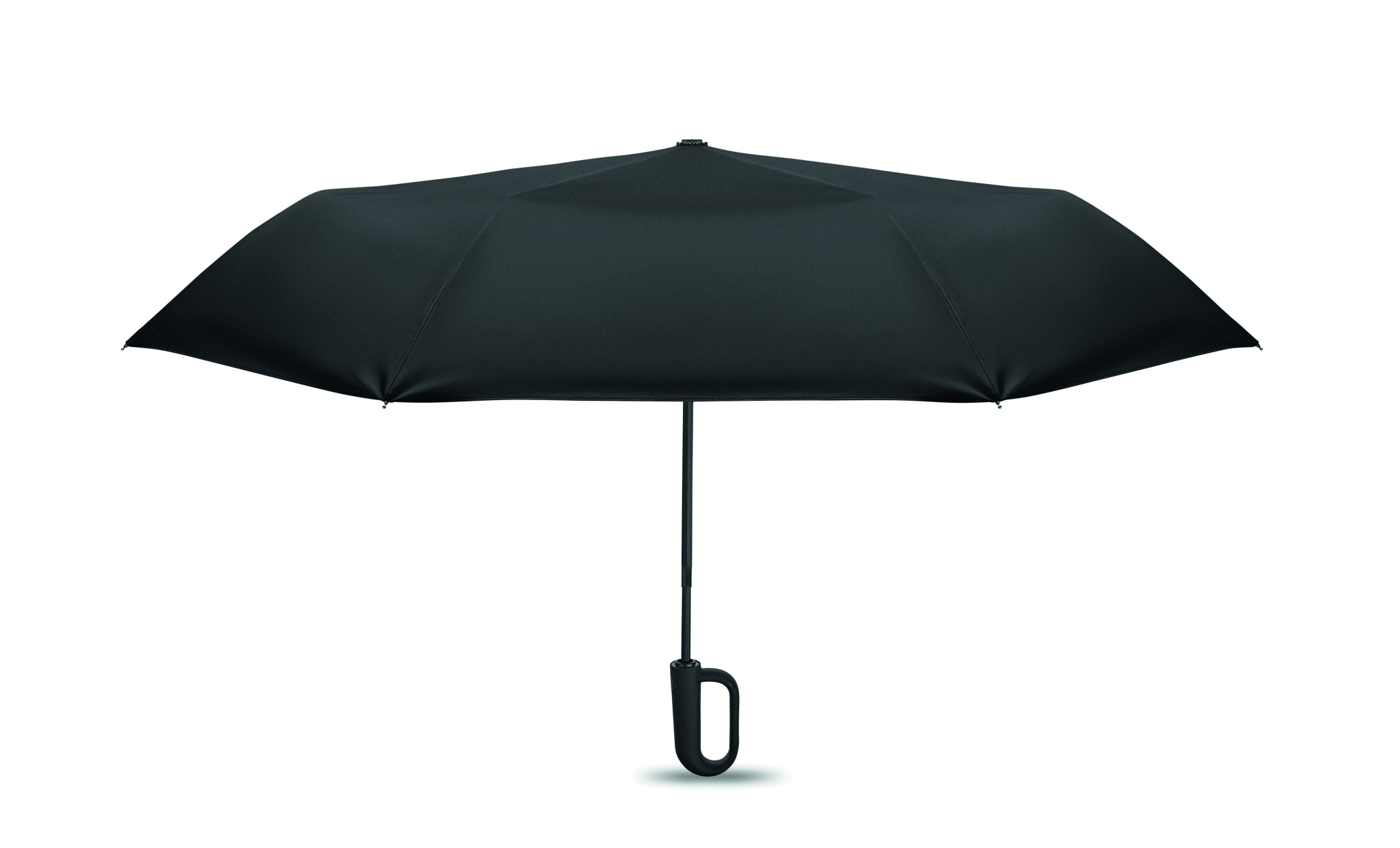 Taitettava 21'' tuulenpitävä sateenvarjo, jossa on täysin musta pinnoitettu lasikuiturunko, jossa on 2 osaa. Lasikuituiset kylkiluut. 190T RPET pongee-paneelit. D-muotoinen karabiinikahva w / kumipinta,. Automaattinen avautuminen ja sulkeminen. Sisältää pussin