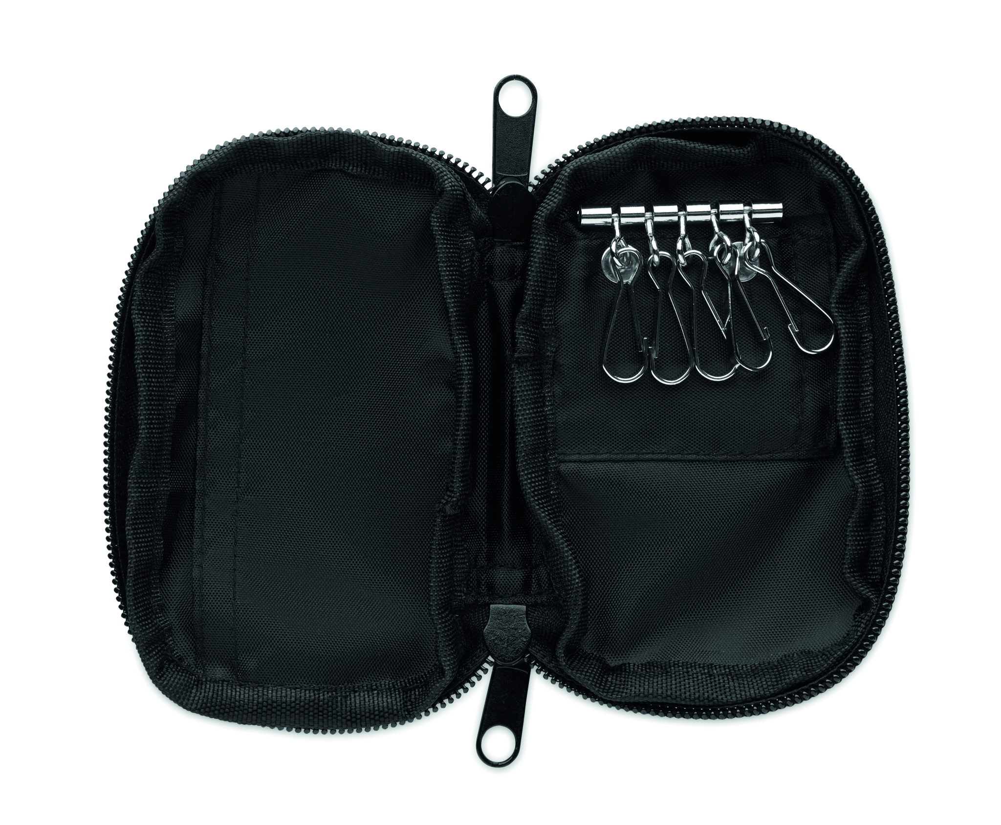 Vetoketjullinen avainkotelo 300D RPET:stä, jossa on 210D RPET-vuori. Siinä on 5 avaimenpidikettä.