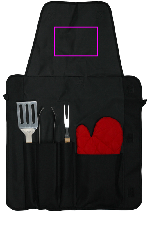 Nailoninen esiliina grillikäsineellä, ruostumattomasta teräksestä valmistettu haarukka, pihdit ja kääntäjä puukahvalla. Painamme logosi esiliinaan.