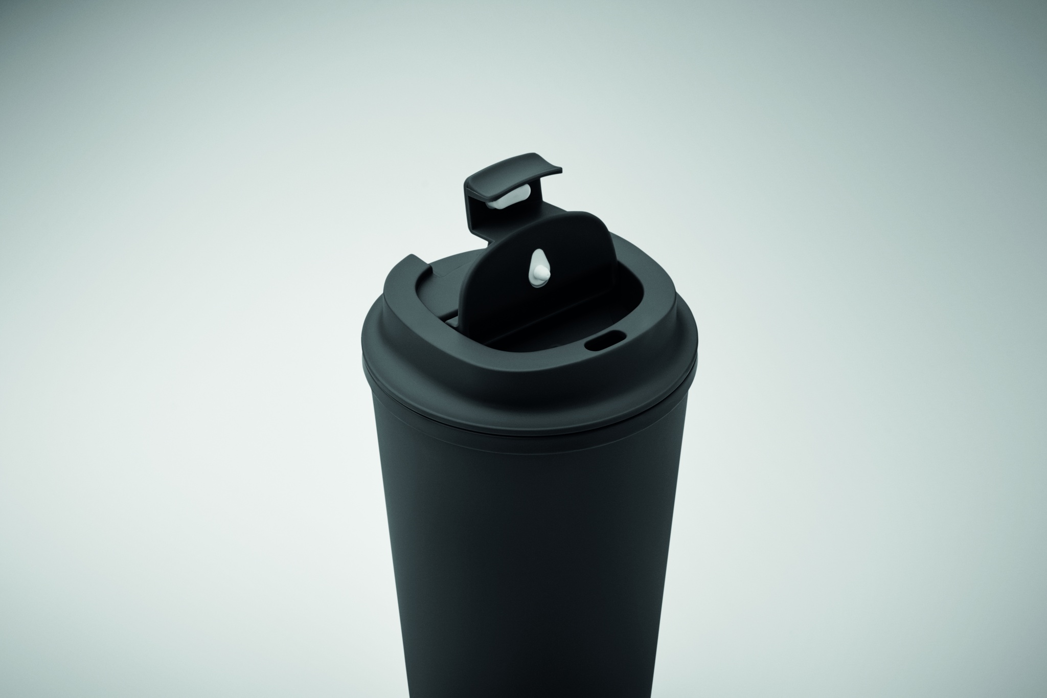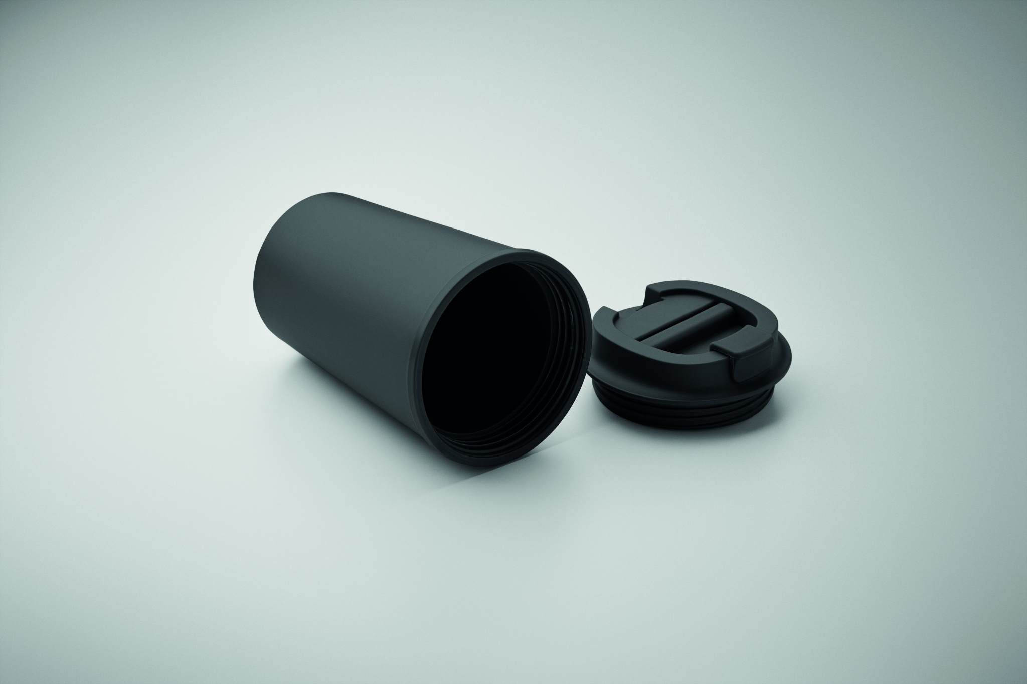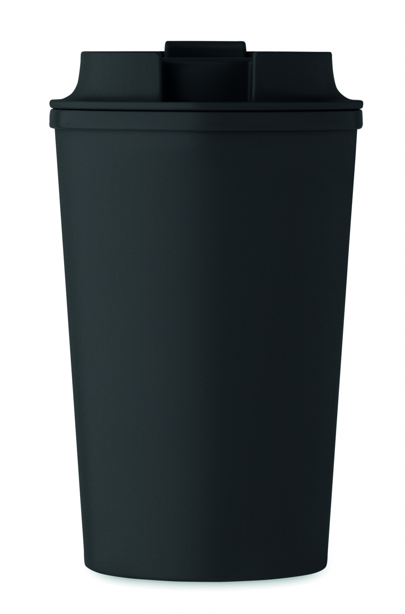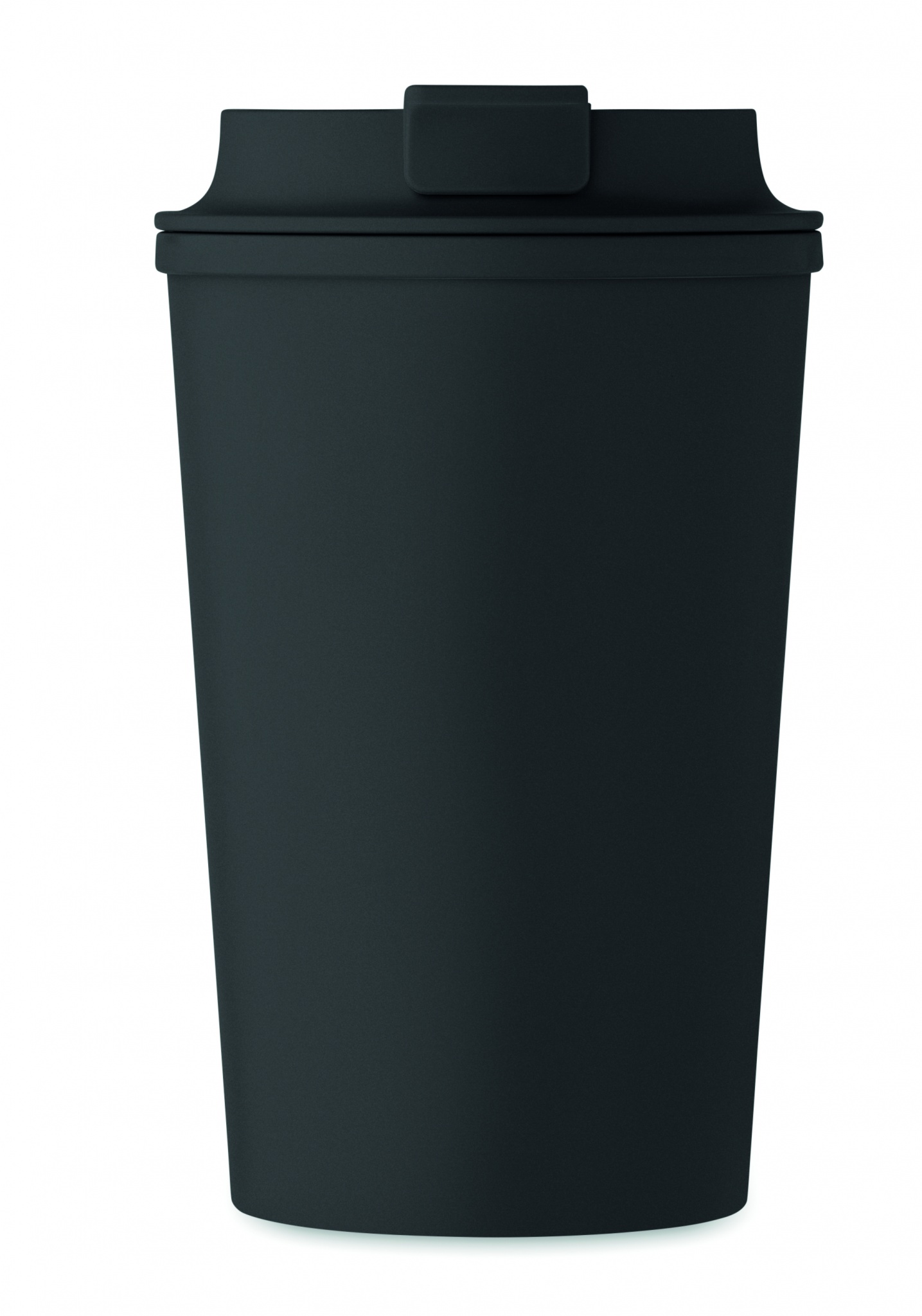 Kaksiseinäinen juomapullo 100 % PLA maissista, jossa on kierrätetty PP-juomakansi, jossa on sisäpuolinen TPR. Vuotamaton. Tilavuus: 350 ml.