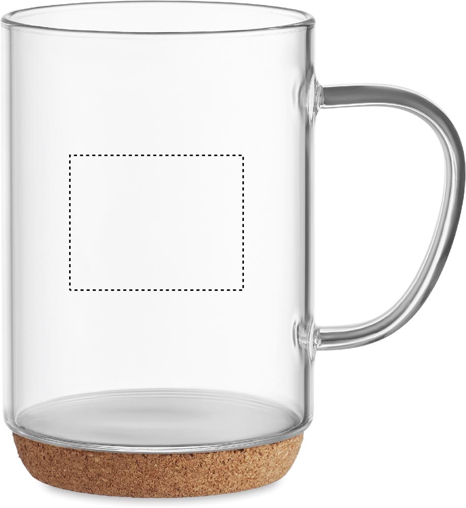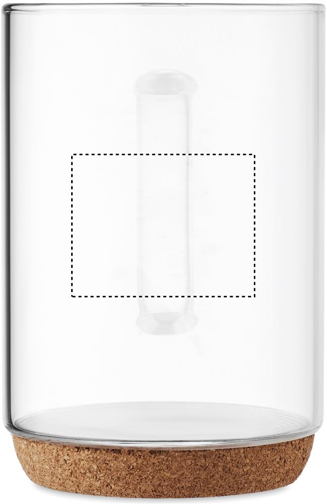 Borosilikaattilasista valmistettu 400 ml juomalasi korkki pohjalla. Borosilikaattilasiin ei voi kaiverruttaa.