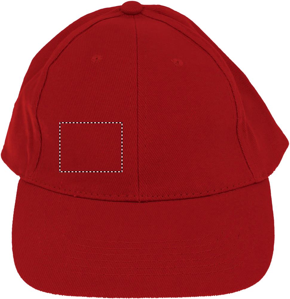 Toimikkaasta puuvillasta valmistettu kuusi paneelinen lippalakki, säädettävä kuparinen solki kiinnitys ja 6 samaan sävyyn ommeltua ilmareikää. Koko 7 1/4.