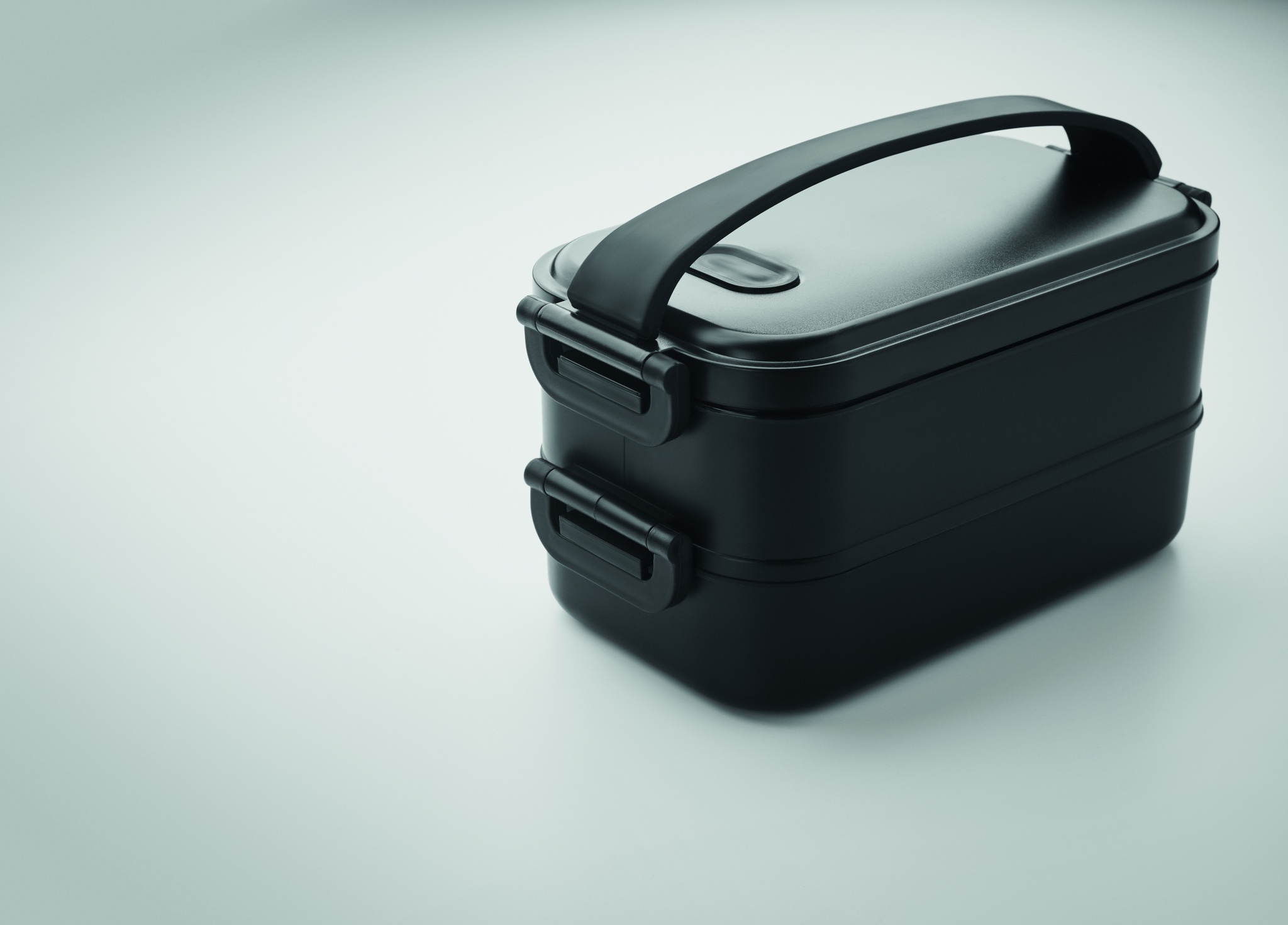 Kaksiosainen lounasrasia, valmistettu kierrätys PP:stä. Laatikossa on jakolaatikko, sivusoljet ja ilmatiivis kansi. Tilavuus: 800 ml (2x).