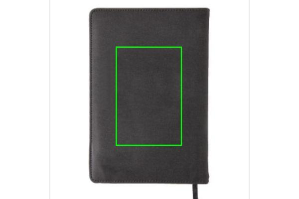 Päällystetty PU-muistikirja, jossa etutasku puhelimelle (14x10cm), tasku kynälle ja päätasku esimerkiksi varavirtalähteelle tai käyntikorteille. Musta sivunjakaja ja 160 sivua 80g/m2. A5 lehtiö kansien sisällä vaihdettavissa.
