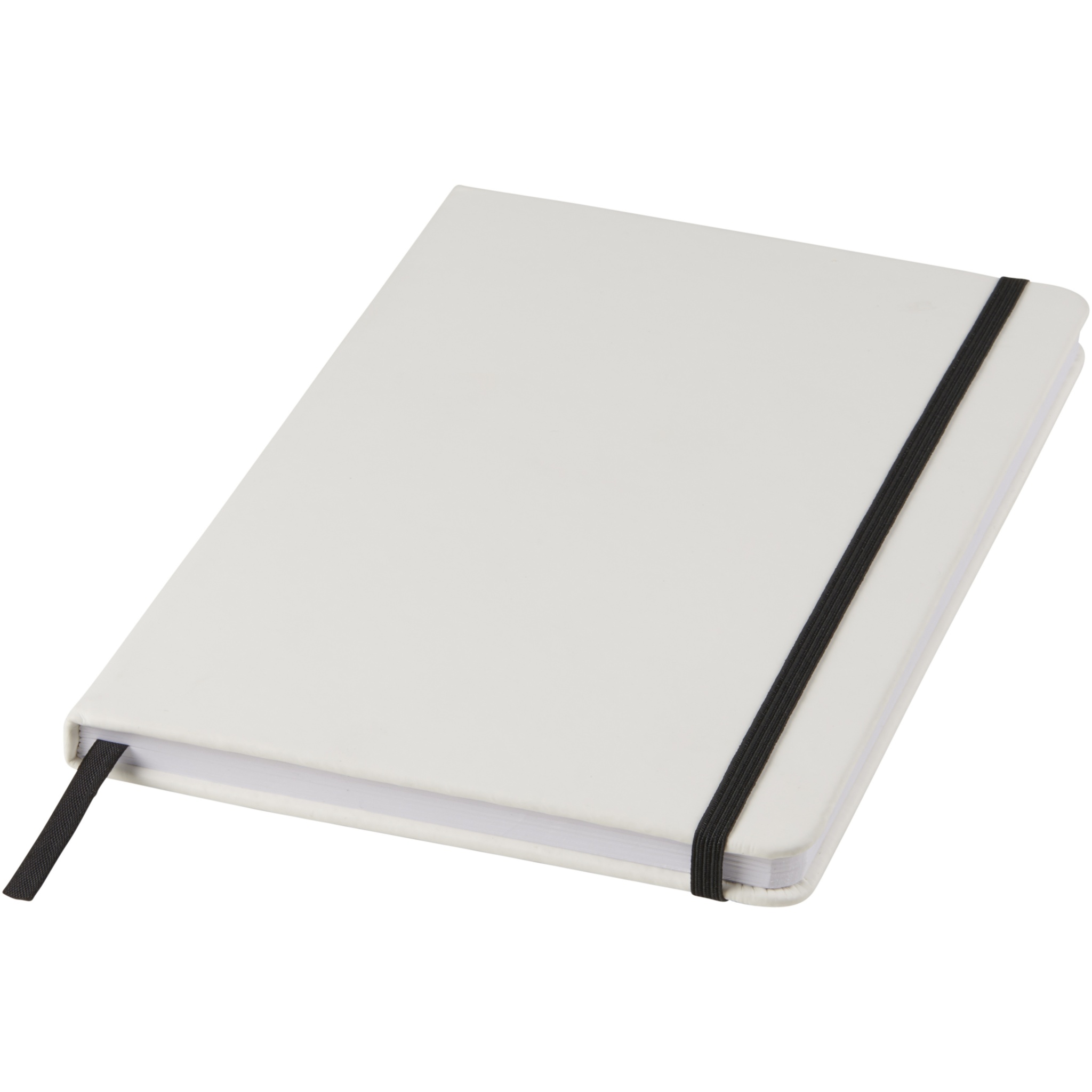 Valkoinen A5 muistikirja värillisellä joustavalla suljentanauhalla ja sivumerkillä. 80 sivua (60g/m2) viivoitettua paperia. Kansi voidaan digipainaa.