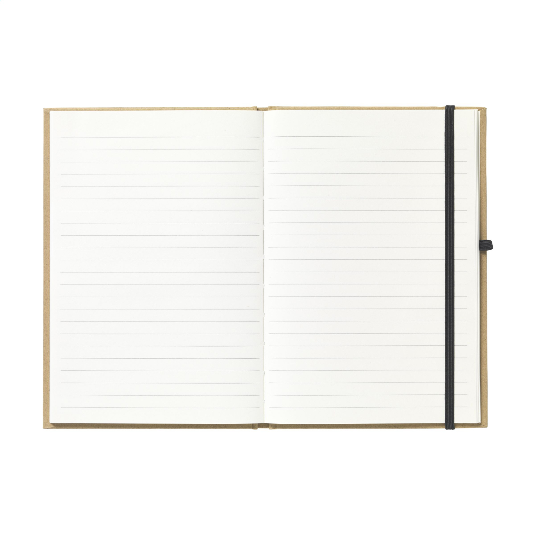 A5 dydžio sąsiuvinis pagamintas iš perdirbtų medžiagų. Su maždaug. 80 lapų/160 puslapių kreminės spalvos linijinio popieriaus (70 g/m²), patogi rašiklio kilpa ir elastingas užsegimas.