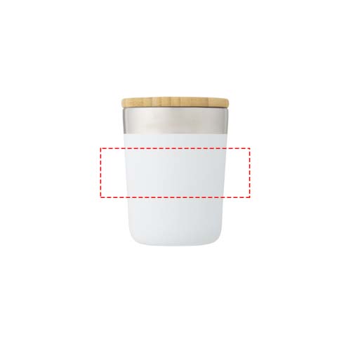 Šiuolaikinio dizaino dvisienis vario vakuuminės izoliacijos puodelis su dangteliu iš organinio bambuko. Izoliuotas 18/8 nerūdijantis plienas išlaiko gėrimus karštus arba šaltus kelias valandas. Be BPA, patikrintas ir patvirtintas pagal Vokietijos maisto saugaus teisės aktus (LFGB) ir patikrintas dėl ftalatų kiekio pagal REACH reglamentą. Tinka po daugeliu kavos aparatų, todėl puikiai tinka darbui keliaujant. Tūrio talpa 300 ml. Pateikta perdirbto kartono dovanų dėžutėje. Rekomenduojama plauti rankomis.