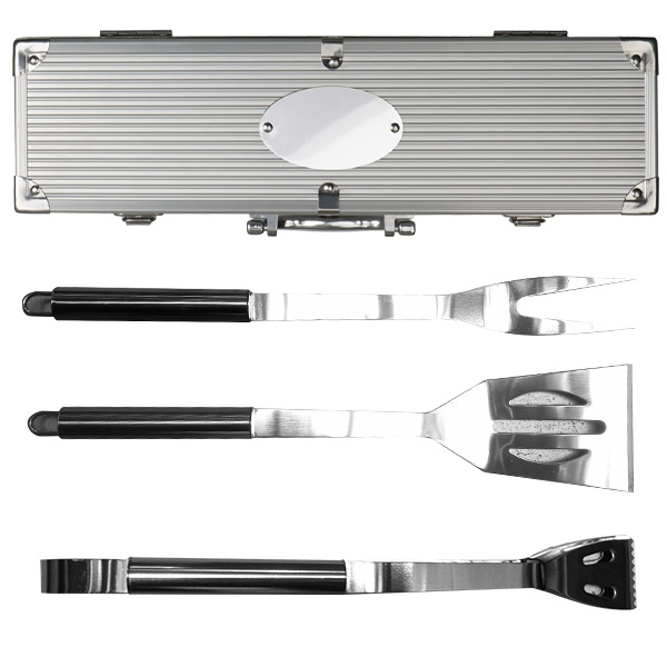 Bārbekjū kaste, kas sastāv no bārbekjū knaiblēm, gaļas dakšas un bārbekjū virpotāja metāla korpusā. Mēs ar lāzeru uzlīmējam jūsu logotipu uz korpusa ovālās metāla plāksnes.