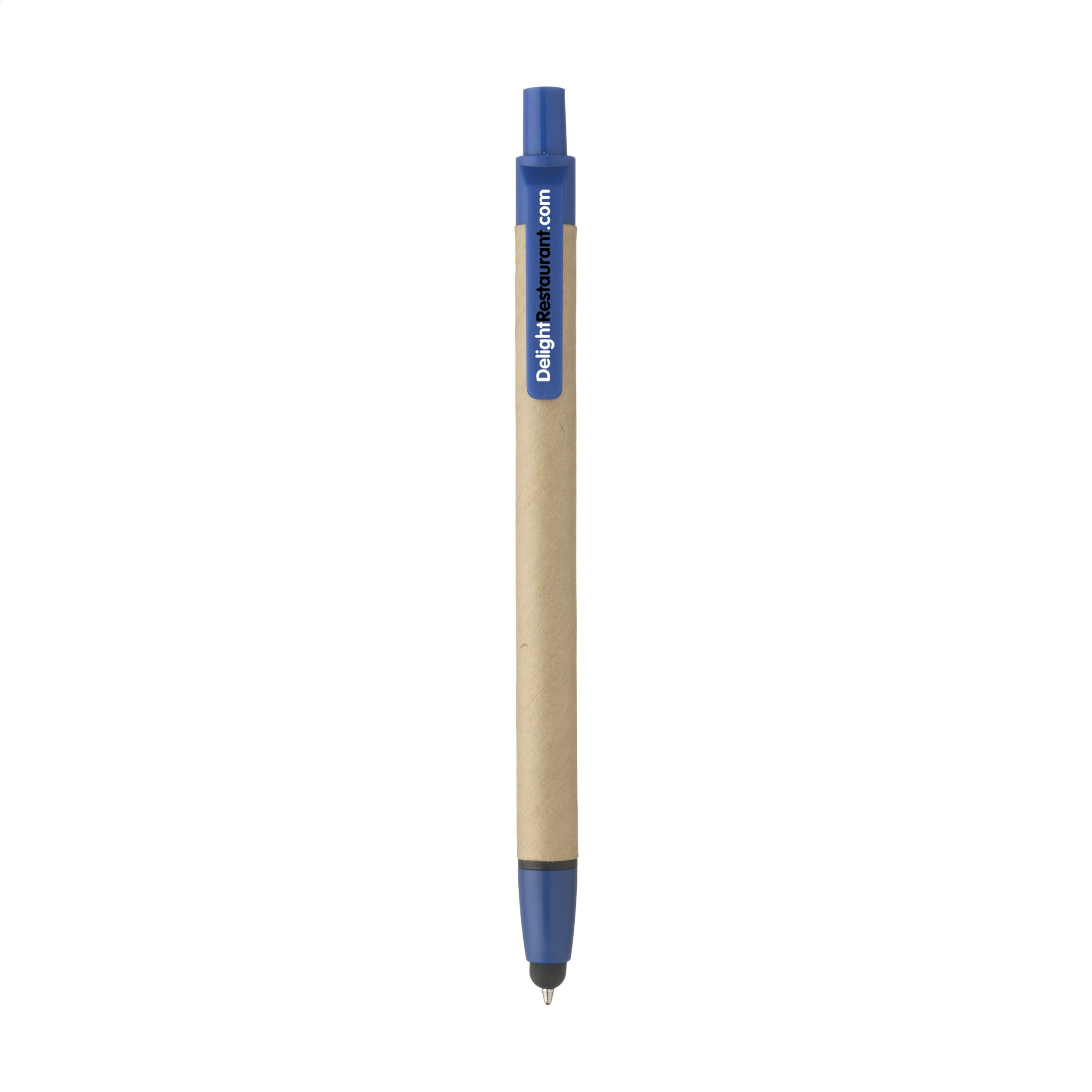 WoW! Zilas tintes lodīšu pildspalva ar stobru, izgatavota no pārstrādāta kartona, gumijas rādītājs skārienekrāna darbināšanai un plastmasas akcentiem.