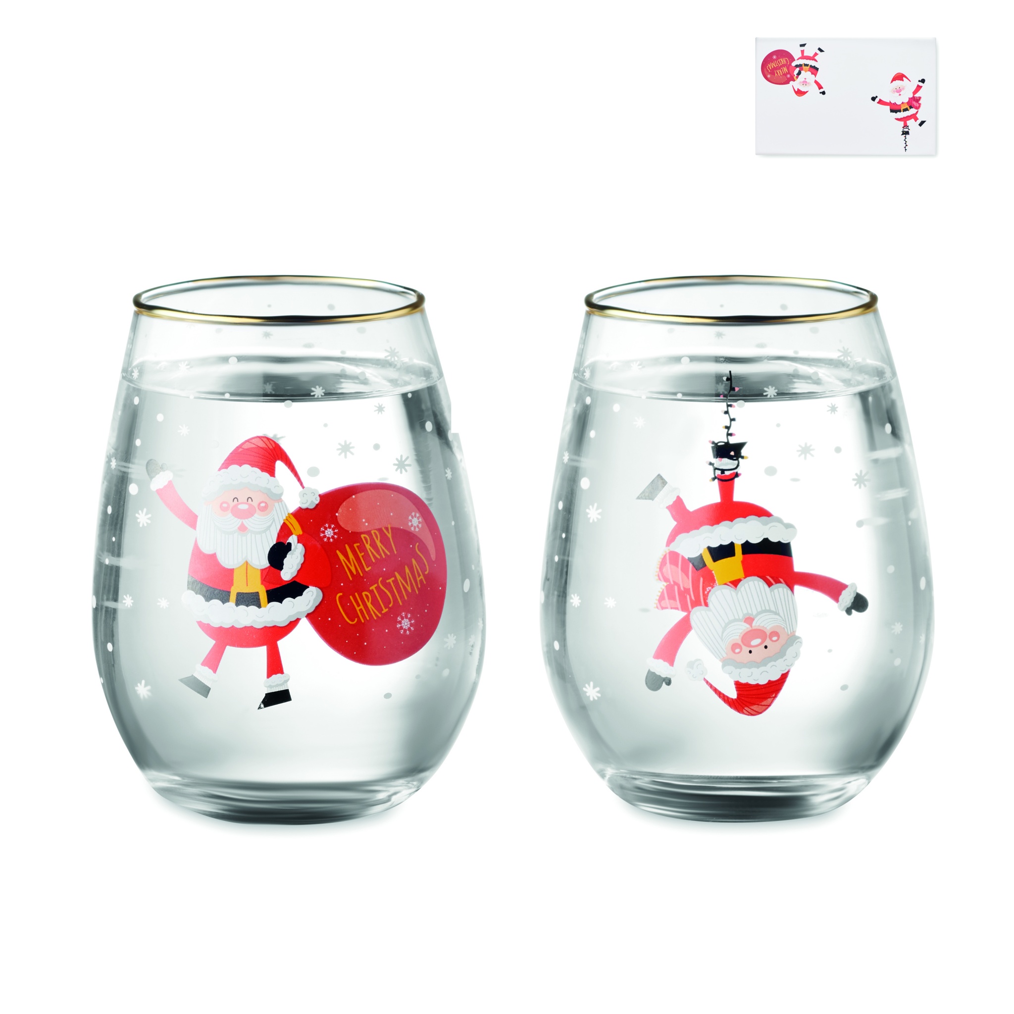 2 Ziemassvētku glāžu komplekts ar zelta maliņu. Prezentēts dāvanu kastītē. Tilpums: 330 ml.