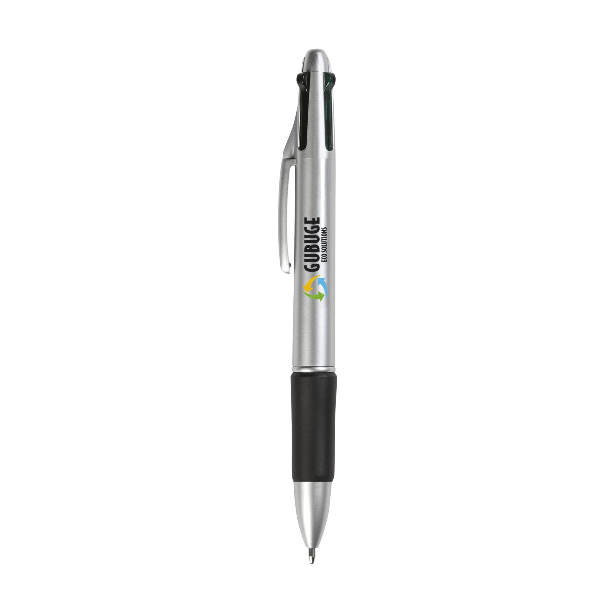 4 krāsu lodīšu pildspalva ar neslīdošu gumijas rokturi. Aprīkots ar zilu, zaļu, sarkanu un melnu tinti.