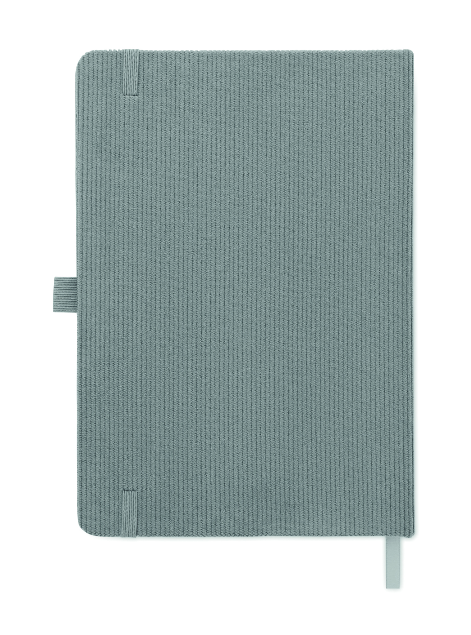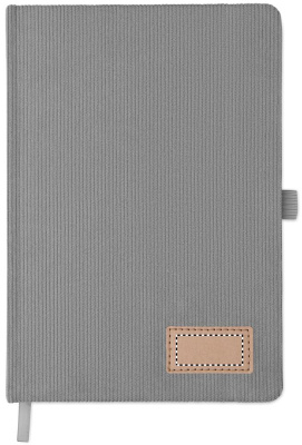 A5 notebook with hard RPET polyester corduroy cover and 192 lined recycled paper pages (70 gr/m2). Casebound design with elastic band closure, pen loop, ribbon page marker, and washed kraft paper tag.