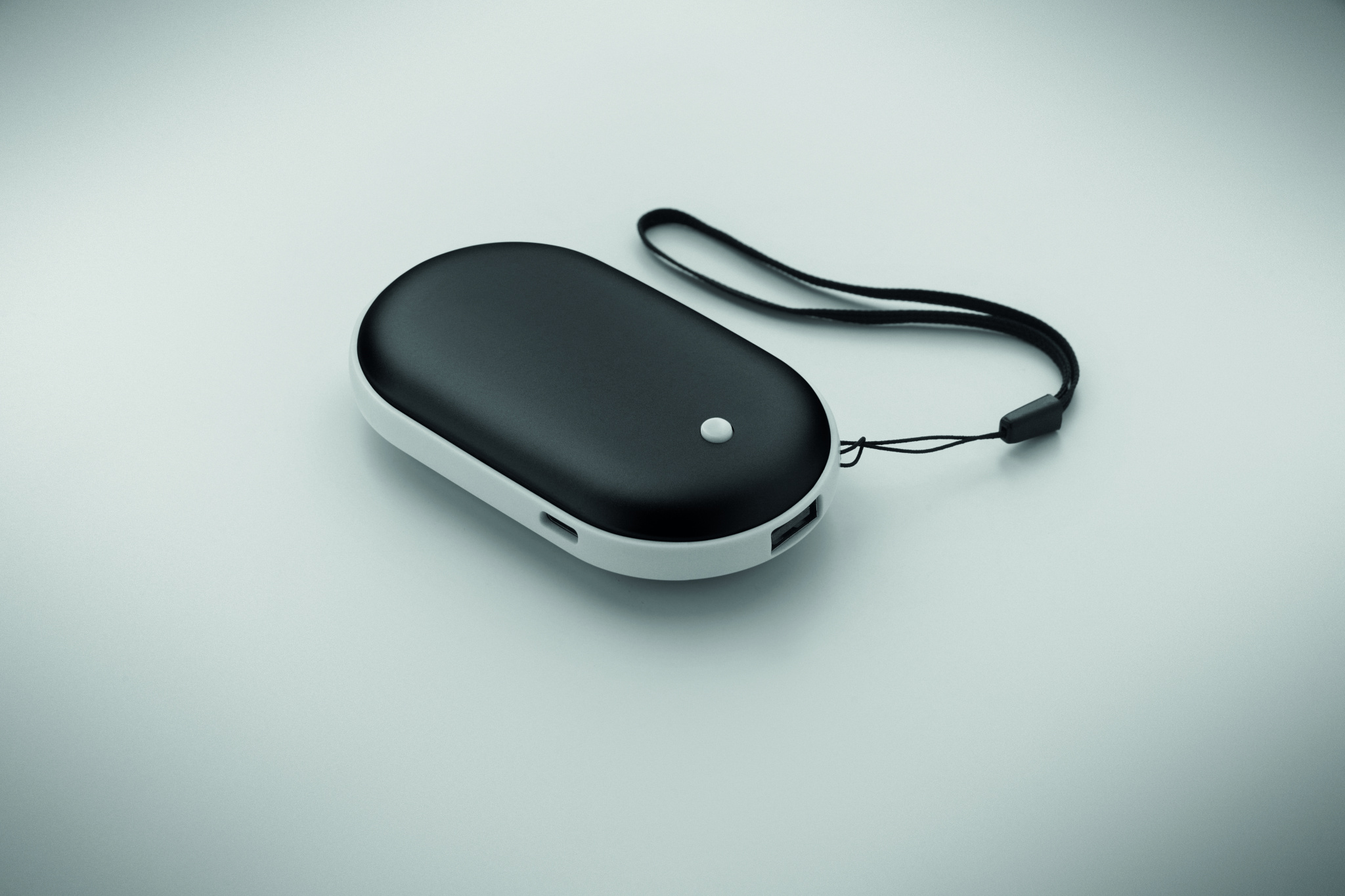 Aluminium electric hand warmer with 3 heat levels (45°C, 50°C, 55°C) and built-in 5000mAh power bank. Dual-sided heating, Type-C input/output, USB-A and DC5V/2A output and charging cable included.