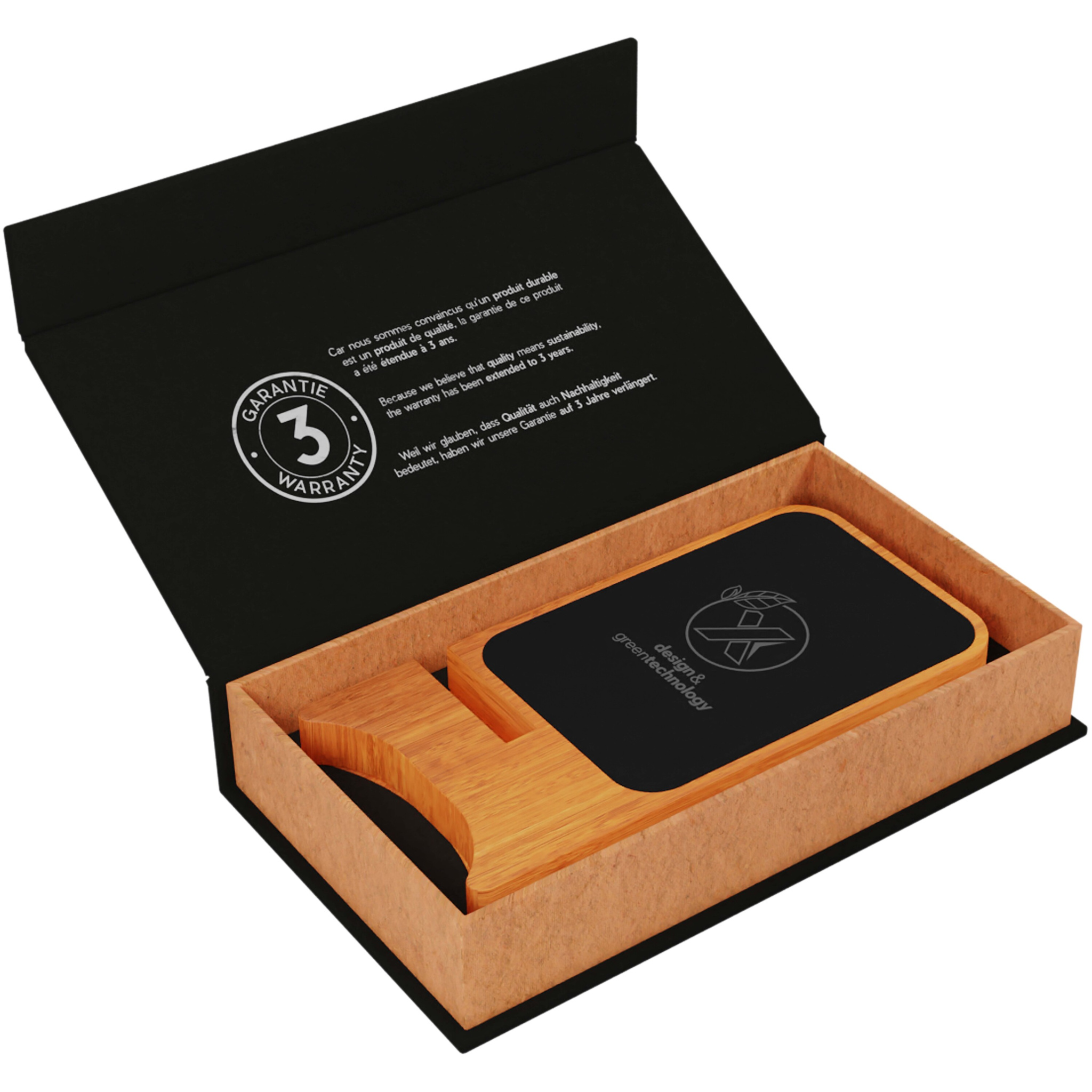 Беспроводное зарядное устройство мощностью 10 Вт из резины и бамбука с антибактериальной обработкой и светящимся логотипом. Вход Type C. Поставляется в черной подарочной коробке из крафт-бумаги вторичной переработки с кабелем из переработанного пластика РЕТ. Патент Ведомства по интеллектуальной собственности Европейского союза.