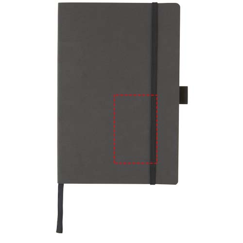 Мягкий на ощупь, гибкий блокнот (размер А5 для ориентации) со встроенной эластичной застежкой, закладкой, петелькой для ручки и кармашка для документов на внутреннем форзаце сзади. 80 листов кремовой линованой бумаги (80г/м2). Упакован в черную коробку-рукав.