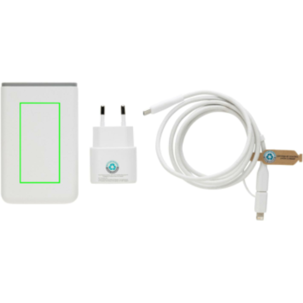 3 шт. комплект для быстрой зарядки 20 Вт для мобильных устройств и других небольших устройств. С адаптером ЕС с портом USB C 20 Вт, внешним аккумулятором 5000 мАч и кабелем для быстрой зарядки из переработанного ТПЭ 60 Вт длиной 120 см (USB C на USB / Lightning). Кабель поддерживает передачу данных, а также зарядку более крупных устройств, таких как ноутбуки. Адаптер, внешний аккумулятор и кабель изготовлены из сертифицированного RCS переработанного ПК, АБС и переработанного ТПЭ. Упакованы в сумку из сертифицированного RCS переработанного ПЭТ. Общее содержание переработанного материала во всем наборе: 59% от общего веса изделия. Сертификация RCS гарантирует полностью сертифицированную цепочку поставок переработанных материалов. Упаковано в упаковку FSC®. Не содержит ПВХ. Входное сетевое зарядное устройство переменного тока 100–240 В 50/60 Гц 0,6 А; Выходное сетевое зарядное устройство USB-C: 5,0 В⎓3,0 А, 9,0 В⎓2,22, 12,0 В⎓1,67 А (макс. 20 Вт). Выходное зарядное устройство 5 В⎓2,4 А - USB-C Входное: 5 В⎓2,4 А