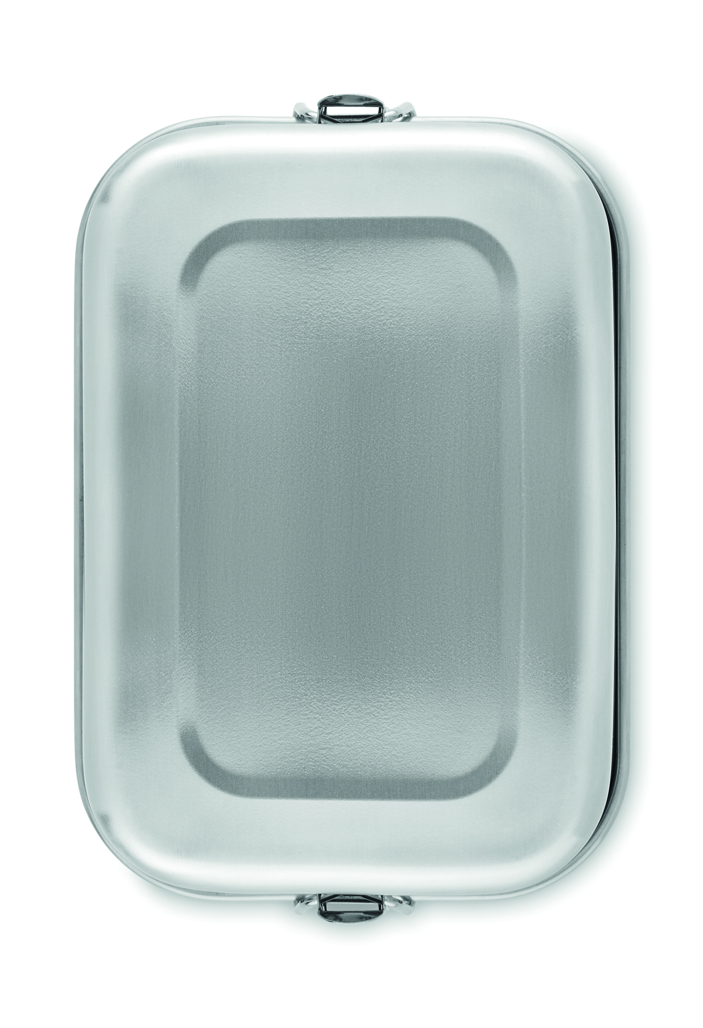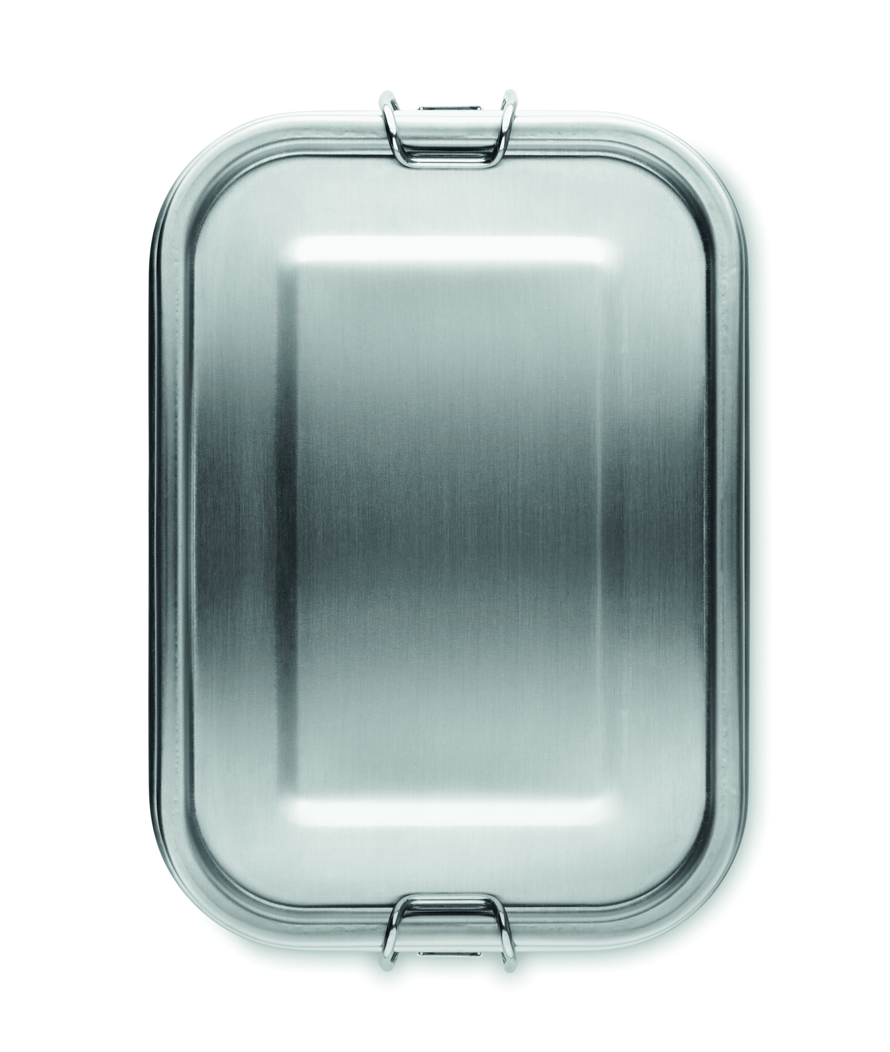 Recycled stainless steel (90 % recycled stainless steel and 10% stainless steel) lunch box with secure side buckles and round corners. Capacity: 750ml.