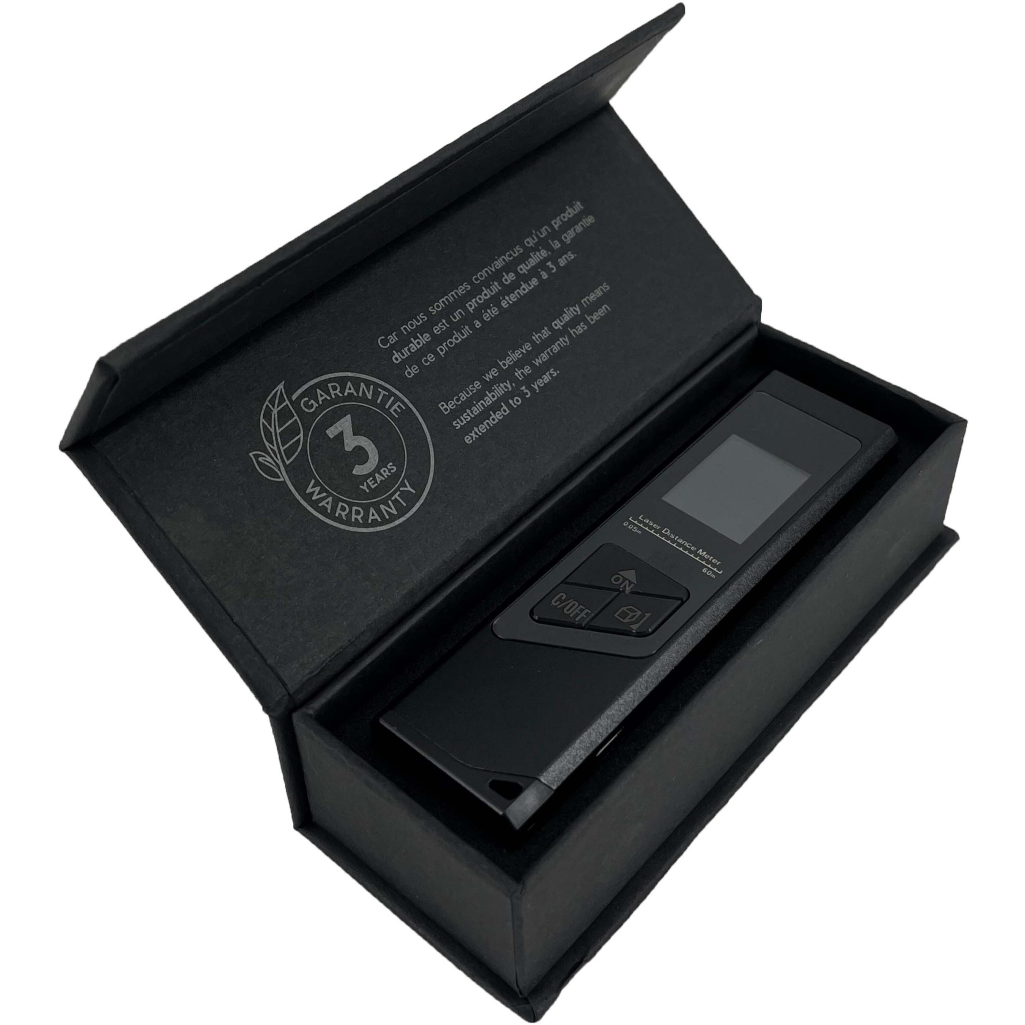 Мини-лазерный телеметр обеспечивает более простой, быстрый и точный способ измерения площади, объема, а также имеет функцию формулы Пифагора. Благодаря технологии лазерной точности и режиму измерения в реальном времени он обеспечивает надежные измерения до 40 метров. Телеметр использует в качестве источника питания энергосберегающий литий-ионный аккумулятор емкостью 200 мА·ч и может измерять расстояние 2000 раз после полной зарядки. Имеет дисплей с подсветкой для удобного просмотра даже в темных местах. Размер: 9 x 2,4 x 1,1 см. Упаковывается в подарочную коробку (10,2 x 4,2 x 3 см) из переработанной бумаги с магнитным замком. Гарантия 3 года.