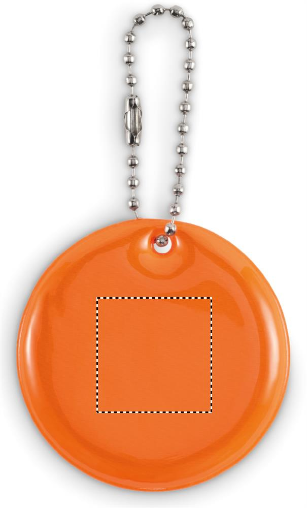 Round reflective keyring in PVC. For promotional use.