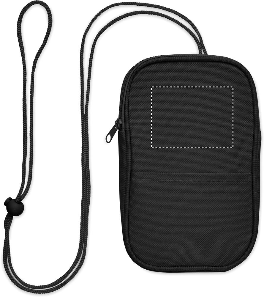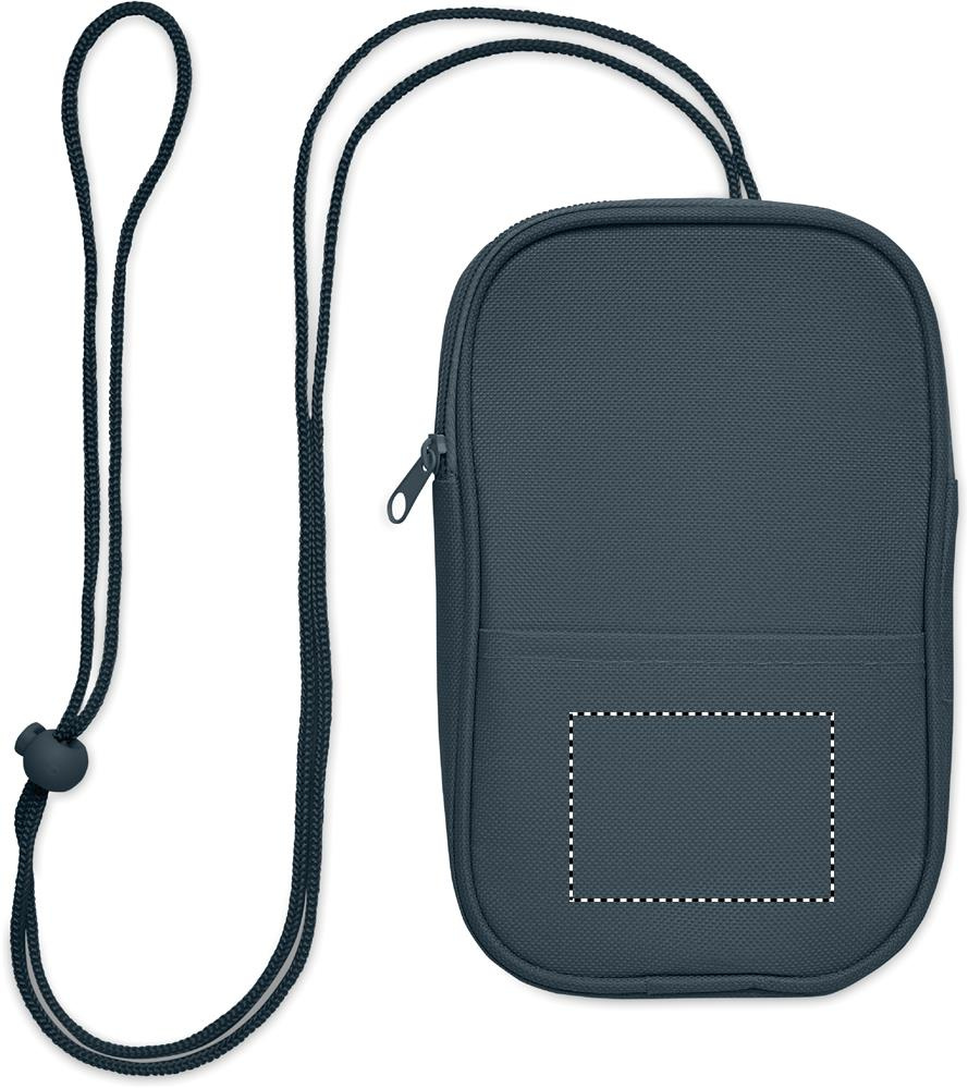 Cross body travel pouch in 600D RPET polyester and 210D RPET lining with cord strap.