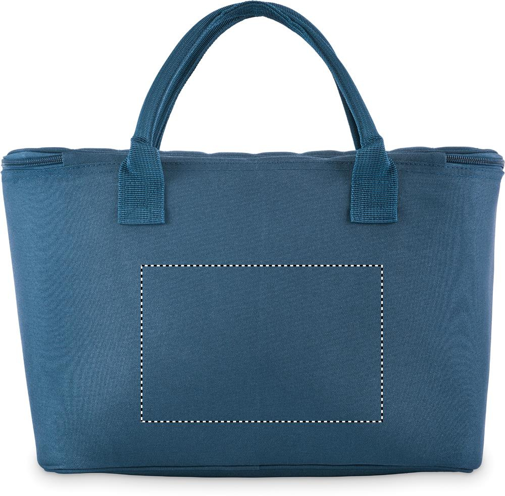 Picnic cooler bag in 600D RPET polyester for 2 people with zippered front pocket including stainless steel cutlery, 2 plates in PS, 2 glasses in PS and 2 cotton napkins. Capacity: 18l